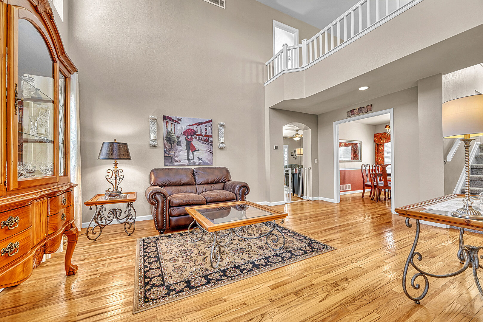 Arched Walkways, Baseboards Wall, Ceiling Fan, Drywall, High Ceiling, Natural Light, Stairs, Textured Wall, Vent, Wood Finish Floor, Baseboards Wall, High Ceiling, Natural Light