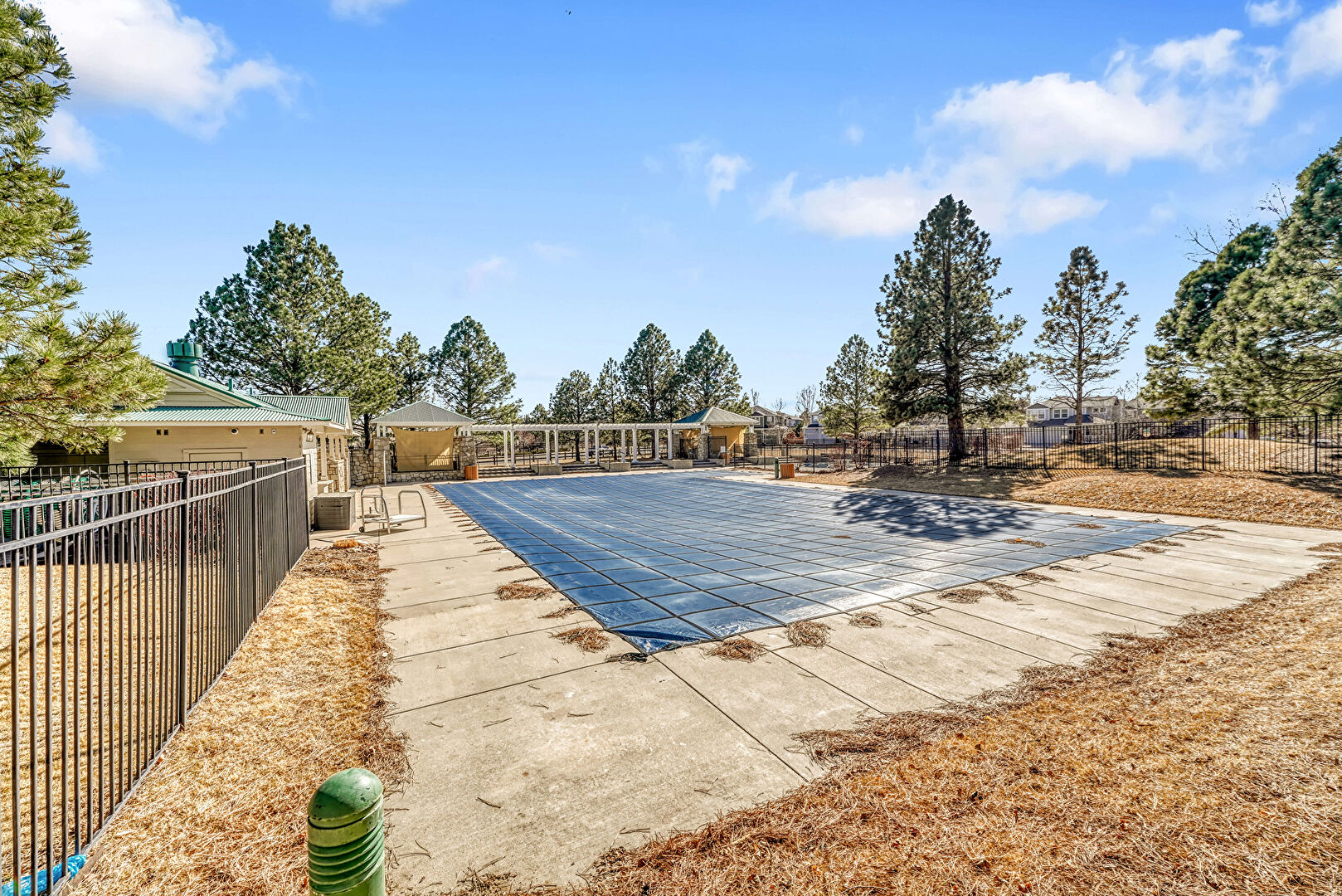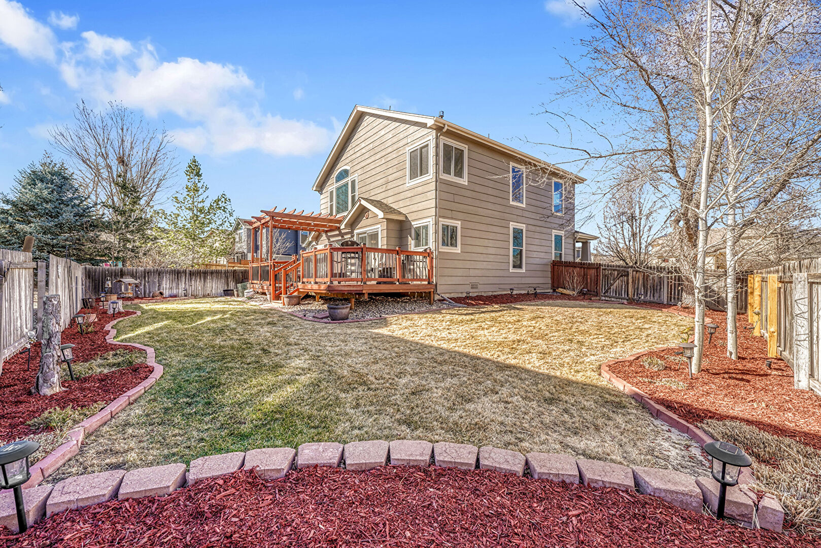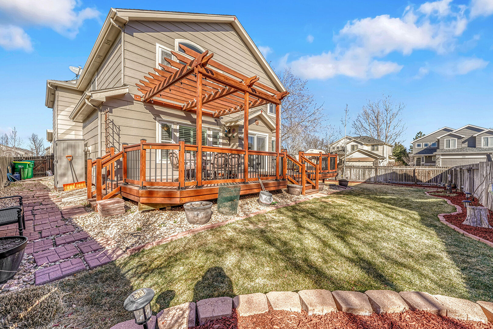 Concrete Foundation, Deck, Downspout, Fence, Gutters, Horizontal Siding, Lawn, Patio, Residential View, Fence, Pergola