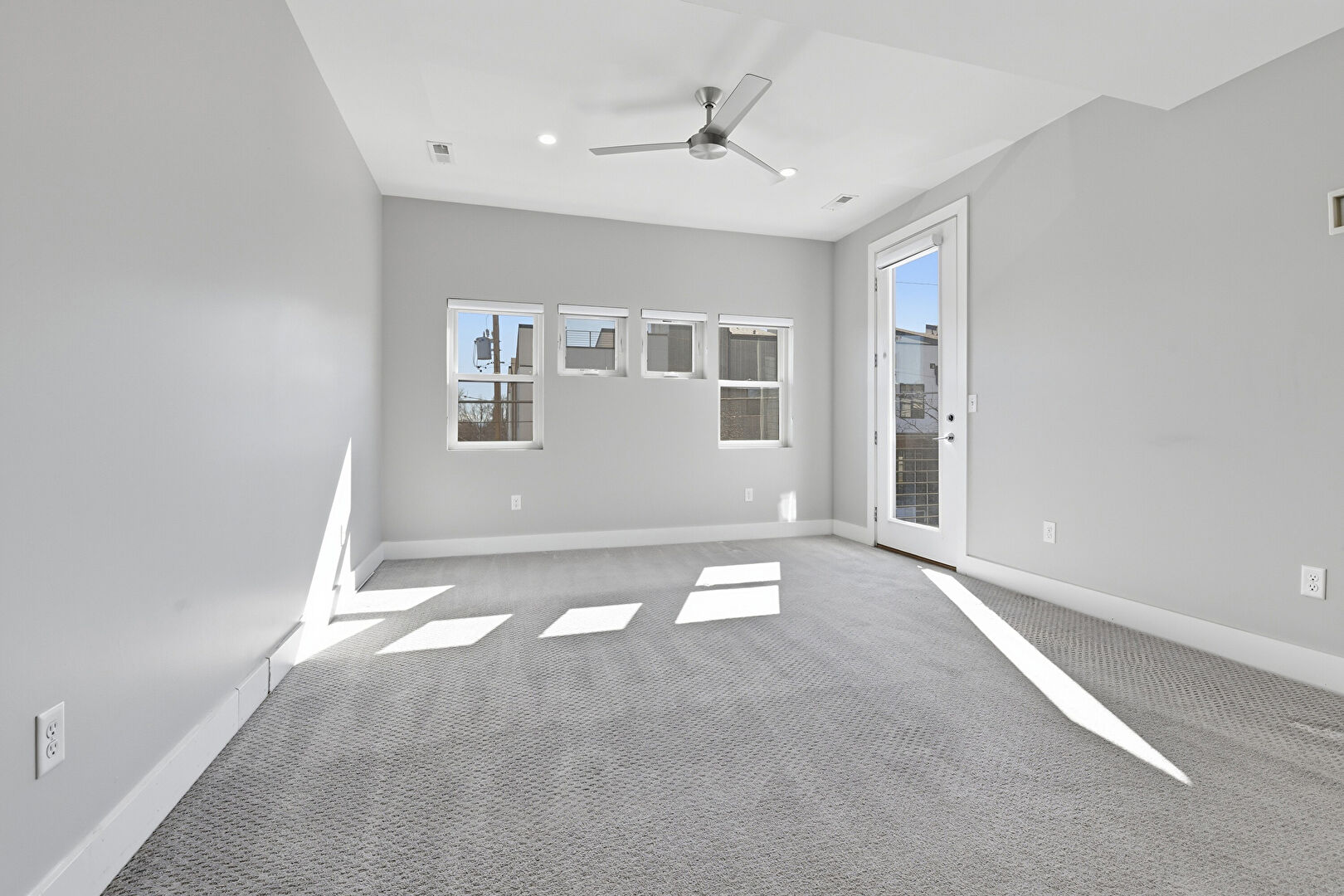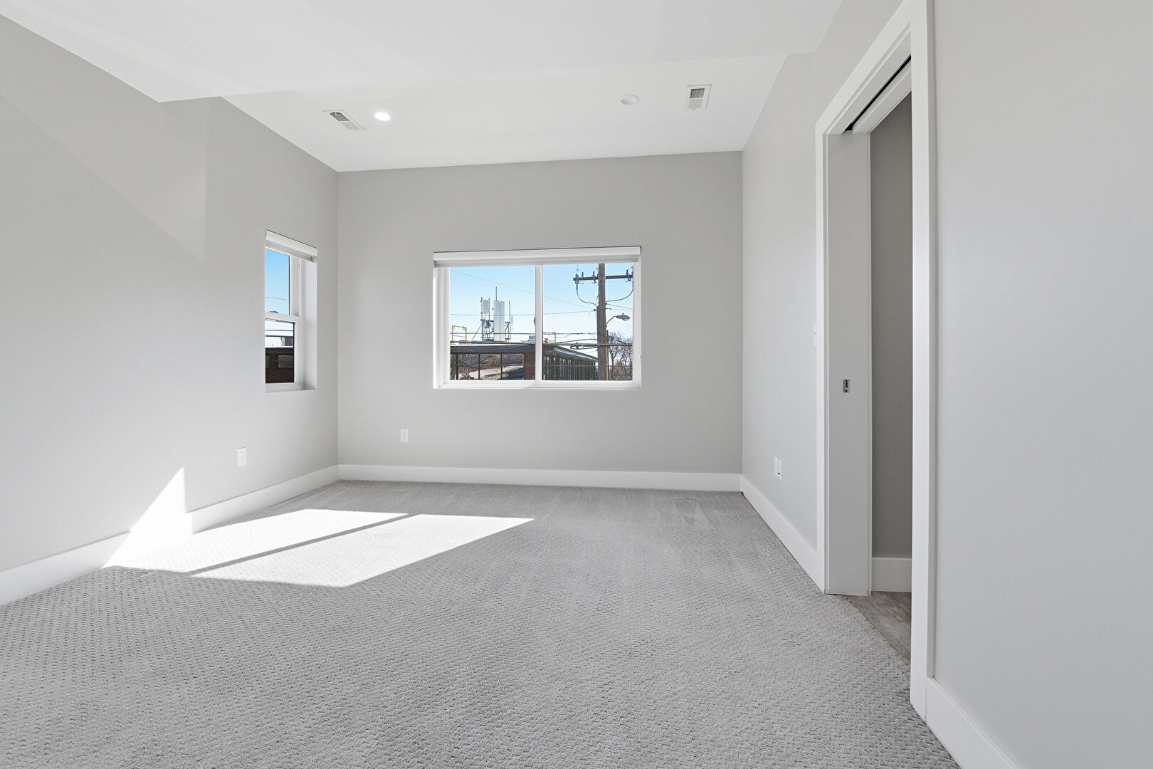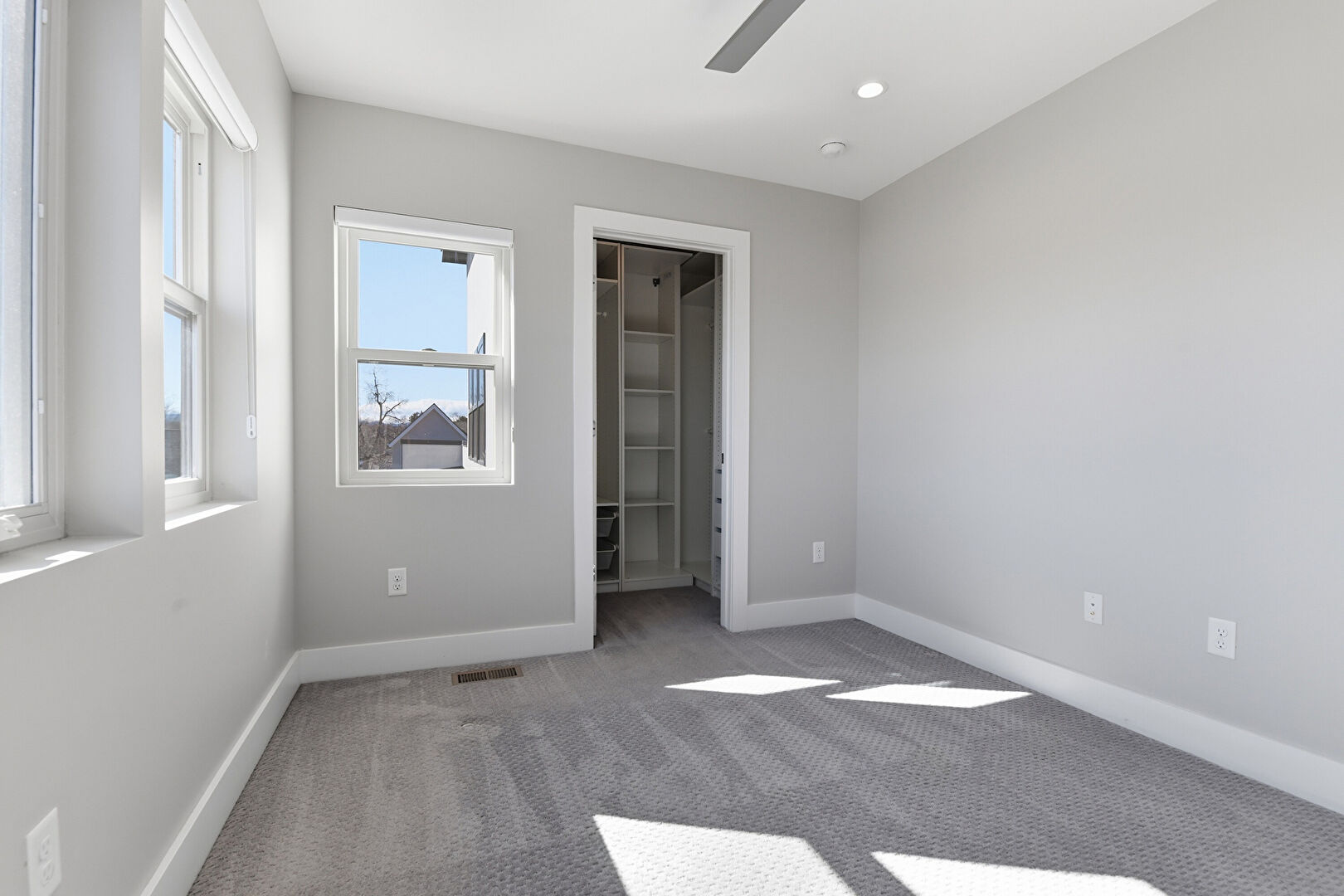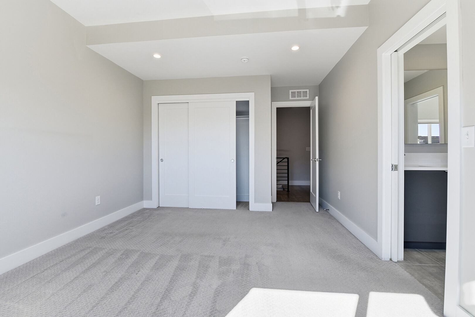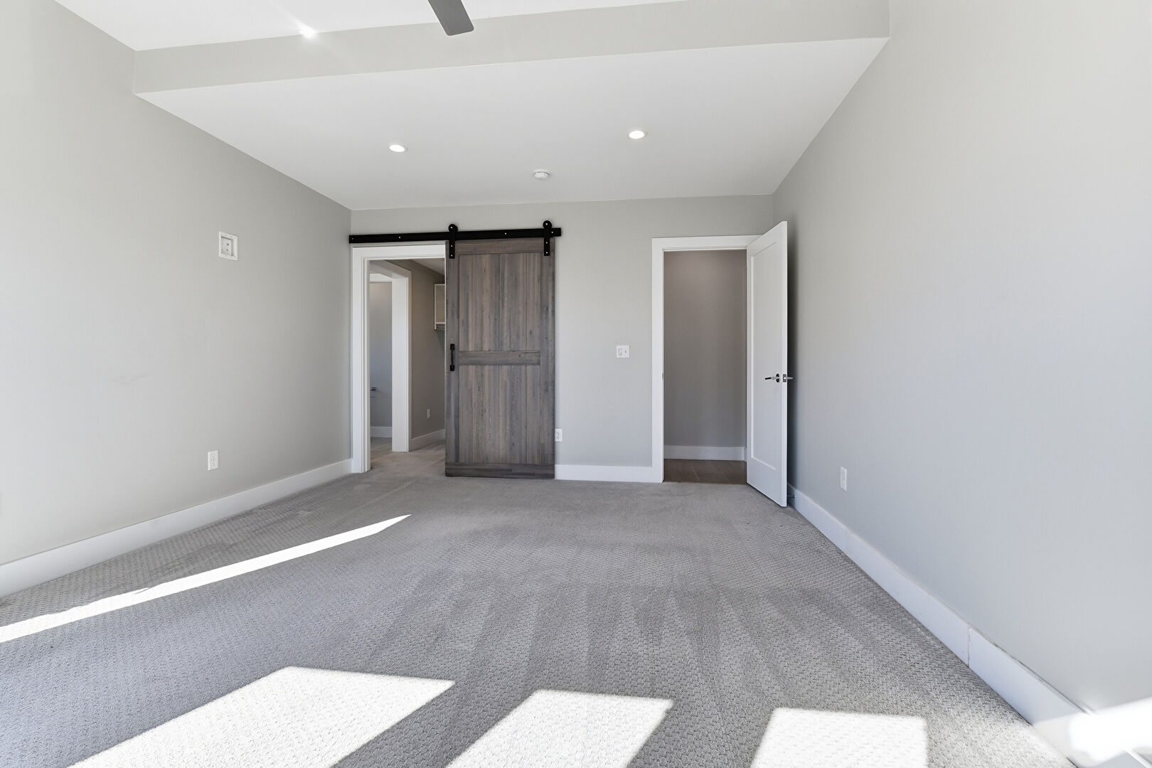 Barn Door, Baseboards Wall, Carpet, Ceiling Fan, Drywall, Natural Light, Recessed Lighting, Smoke Carbon Monoxide Detector, Vent, Carpet, Vent