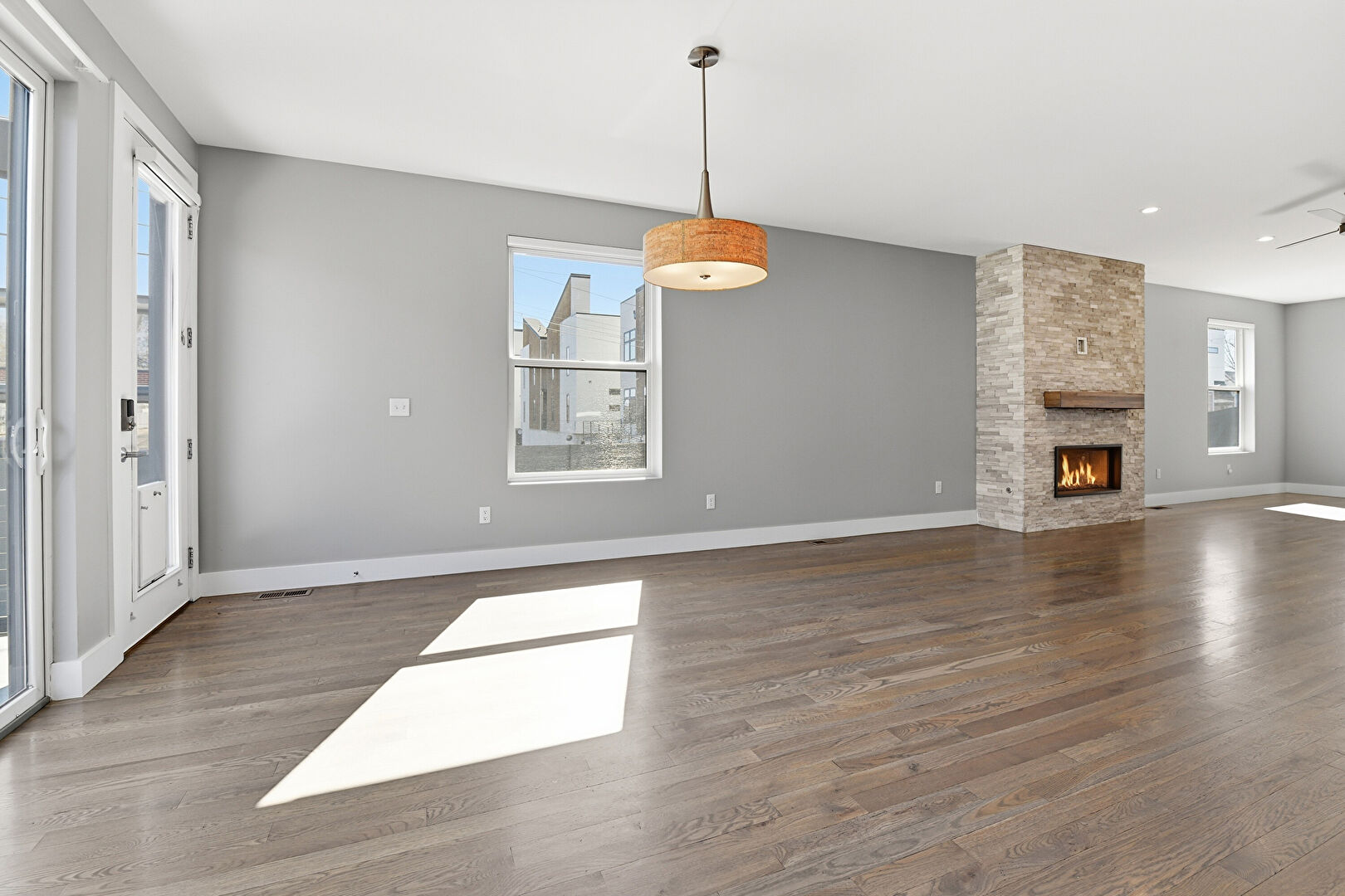 Baseboards Wall, Ceiling Fan, Drywall, Fireplace, Natural Light, Vent, Wood Finish Floor, Natural Light, Vent