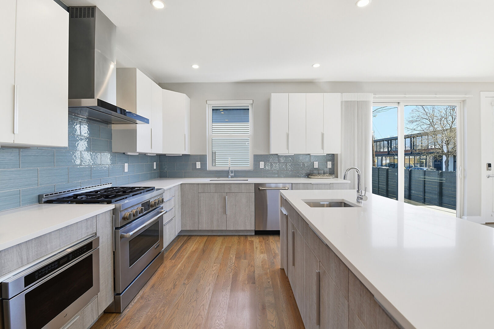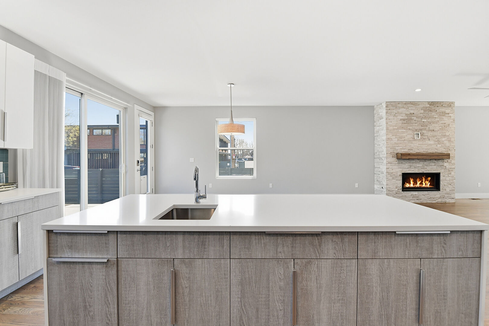 Baseboards Wall, Ceiling Fan, Drywall, Fireplace, Flat Panel Cabinets, Kitchen Island, L Shaped Kitchen, Natural Light, Opens To Living Area, Pendant Lighting, Recessed Lighting, Stone Countertops, Vent, Warming Drawer, Wood Finish Floor, Baseboards Wall, Flat Panel Cabinets, Natural Light, Recessed Lighting, Stone Countertops, Wood Finish Floor