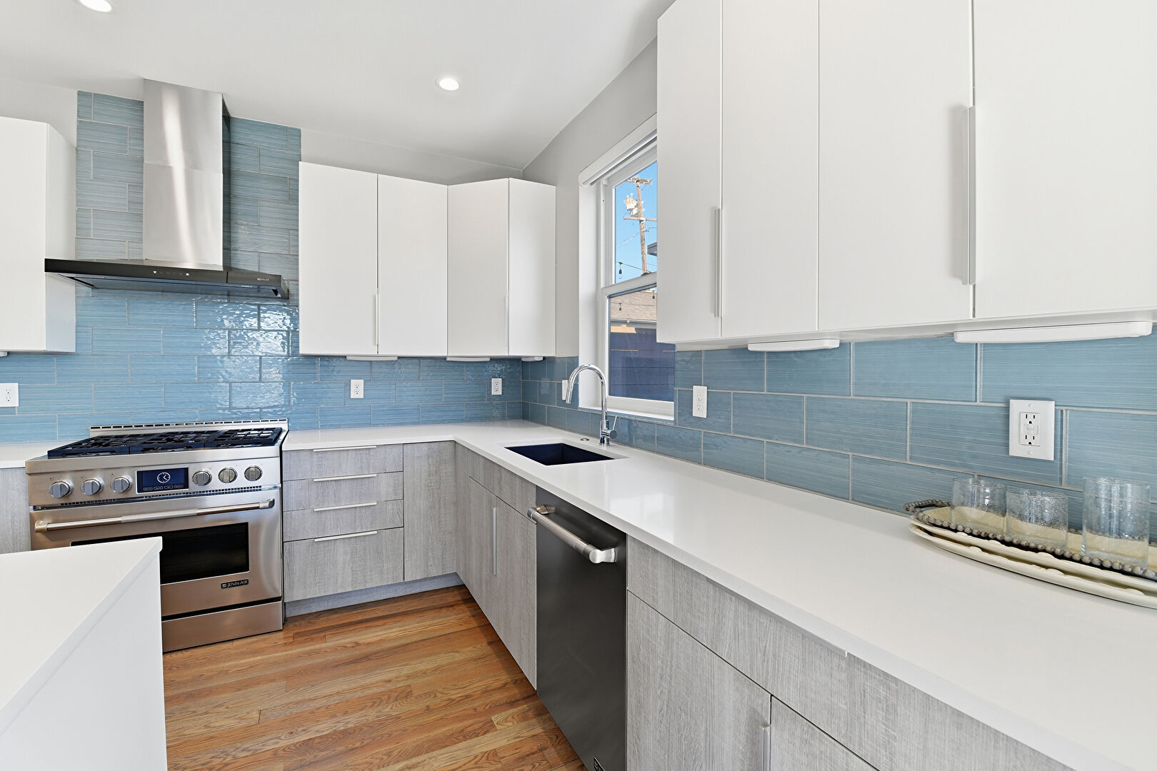 Baseboards Wall, Black Cabinets, Drywall, Flat Panel Cabinets, Indoor Bar, Natural Light, Recessed Lighting, Stone Countertops, Vent, Wine Cooler, Wood Finish Floor, Blue Cabinets, Indoor Bar, Natural Light