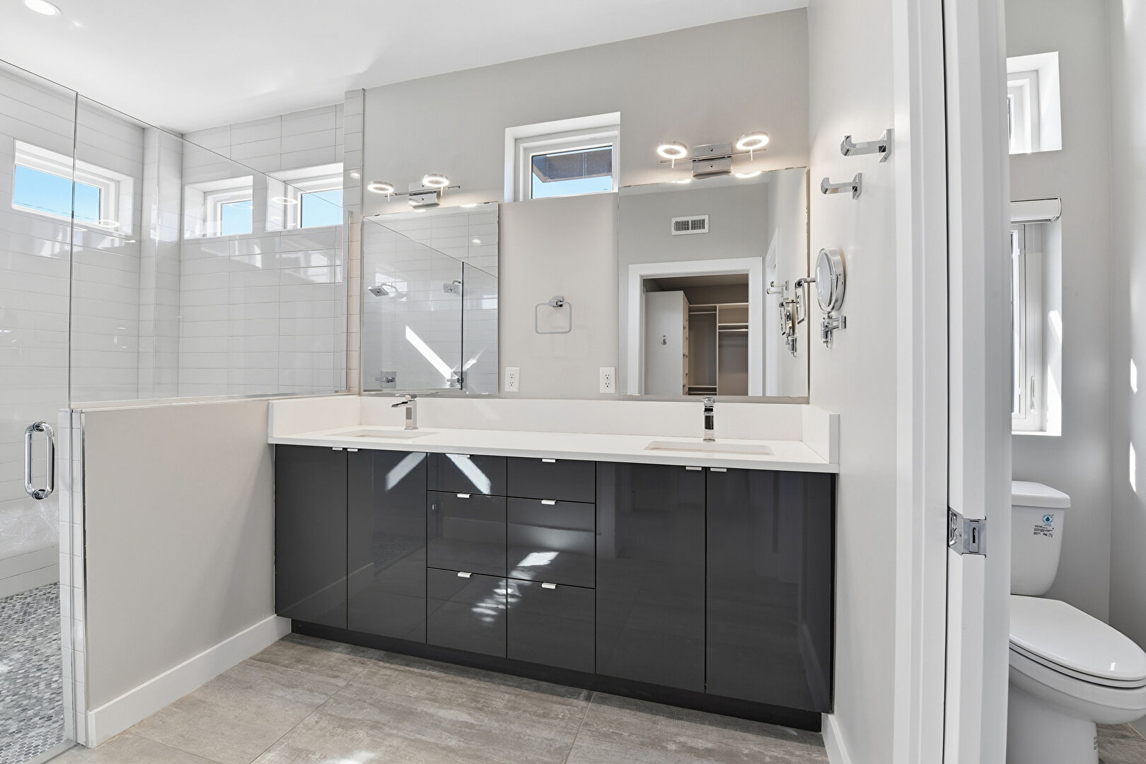 Baseboards Wall, Double Vanity, Drywall, Full Bathroom, Natural Light, Vanity, Vent, Walk In Closet, Water Closet, Wood Finish Floor, Baseboards Wall, Drywall, Full Bathroom, Recessed Lighting