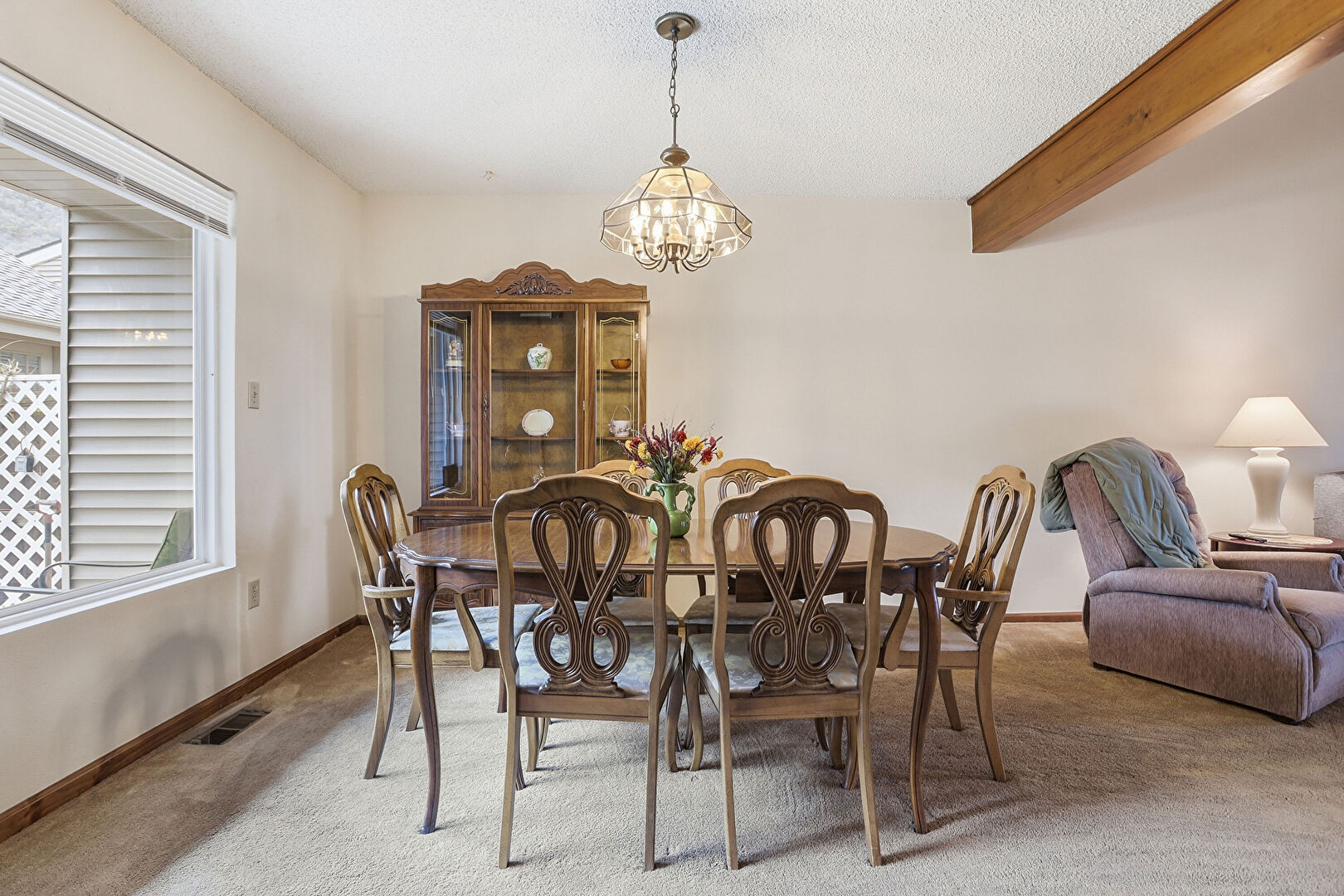 Baseboards Wall, Beamed Ceiling, Carpet, Drywall, Natural Light, Notable Chandelier, Office Area, Textured Ceiling, Trash Compactor, Vent, Vinyl Floor, Baseboards Wall, Built In Desk, Natural Light