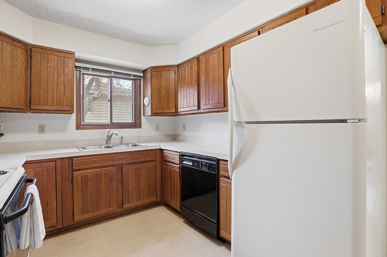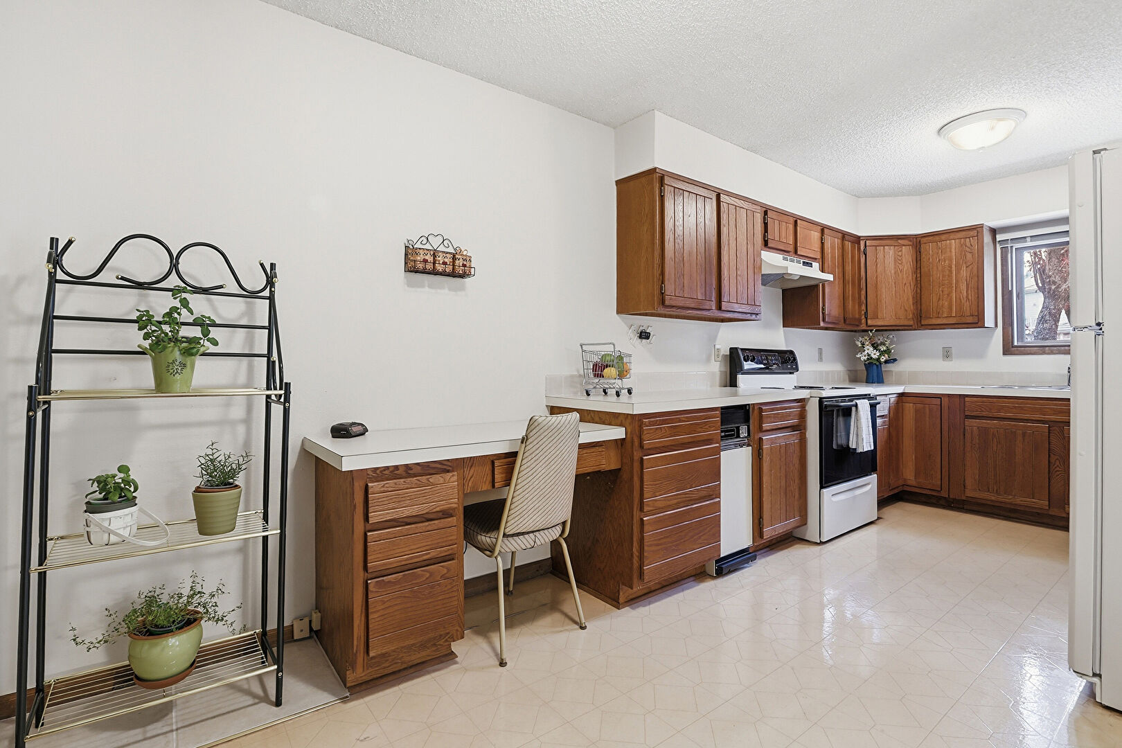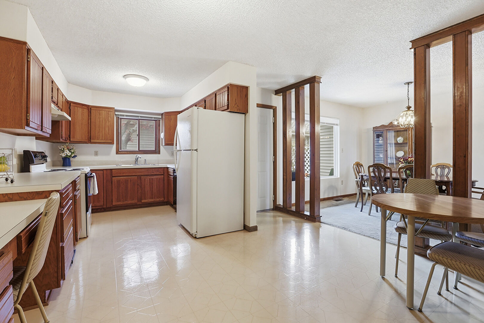 Baseboards Wall, Drywall, Medium Brown Cabinets, Natural Light, Notable Chandelier, Pendant Lighting, Shaker Cabinets, Textured Ceiling, Trash Compactor, U Shaped Kitchen, Vinyl Floor, Visible Hinge Cabinets, Natural Light, Office Area, Shaker Cabinets, Textured Ceiling