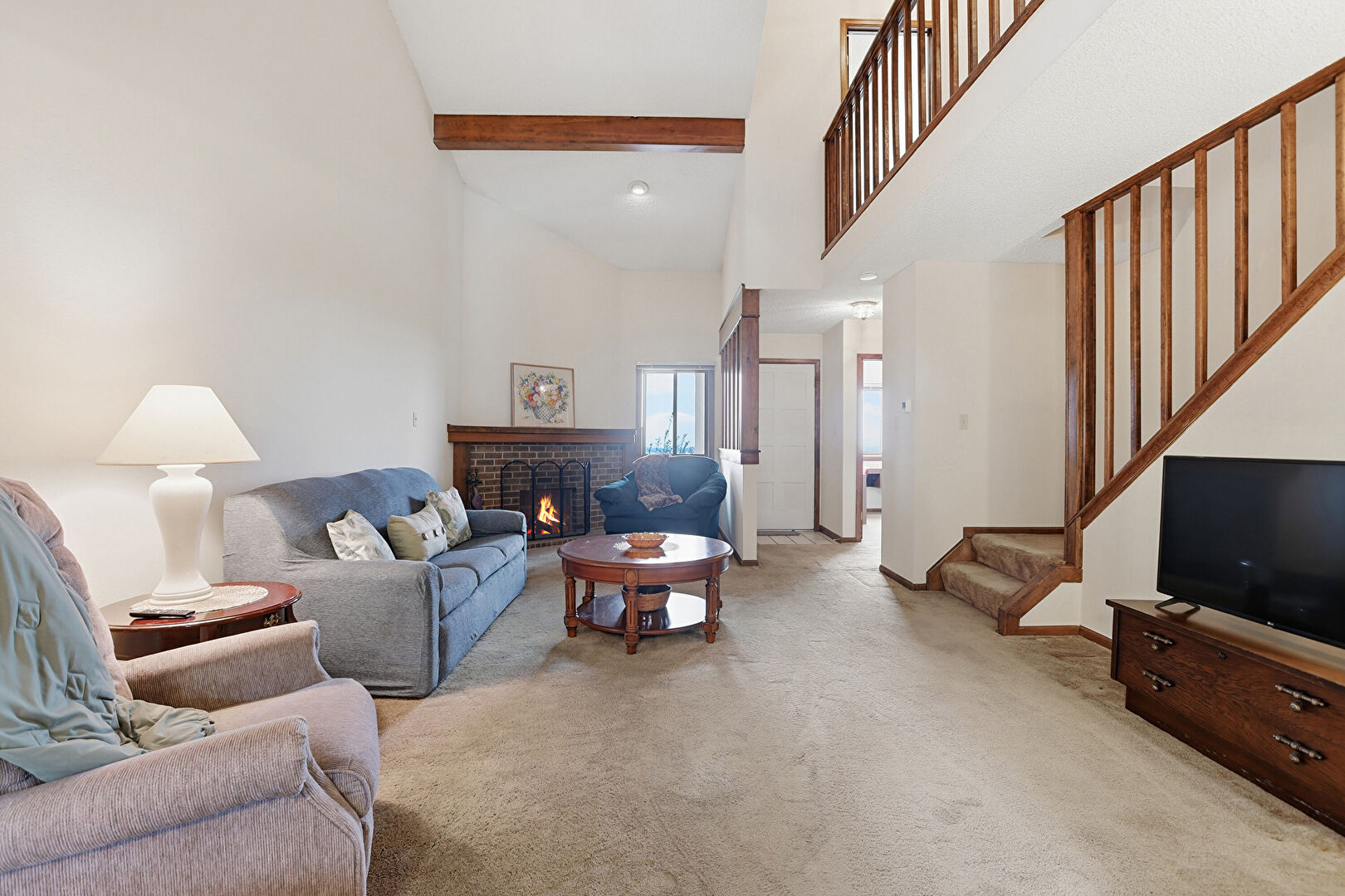 Baseboards Wall, Beamed Ceiling, Carpet, Drywall, Fireplace, High Ceiling, Natural Light, Notable Chandelier, Recessed Lighting, Smoke Carbon Monoxide Detector, Stairs, Vaulted Ceiling, Recessed Lighting, Stairs