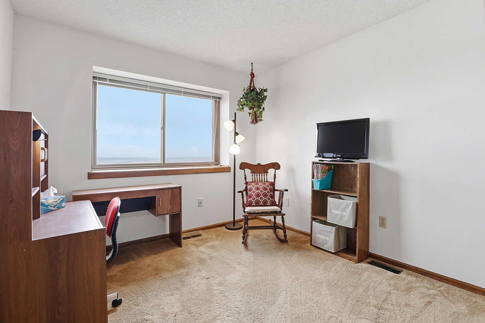 Baseboards Wall, Carpet, Drywall, Office Area, Textured Ceiling, Vent, Natural Light