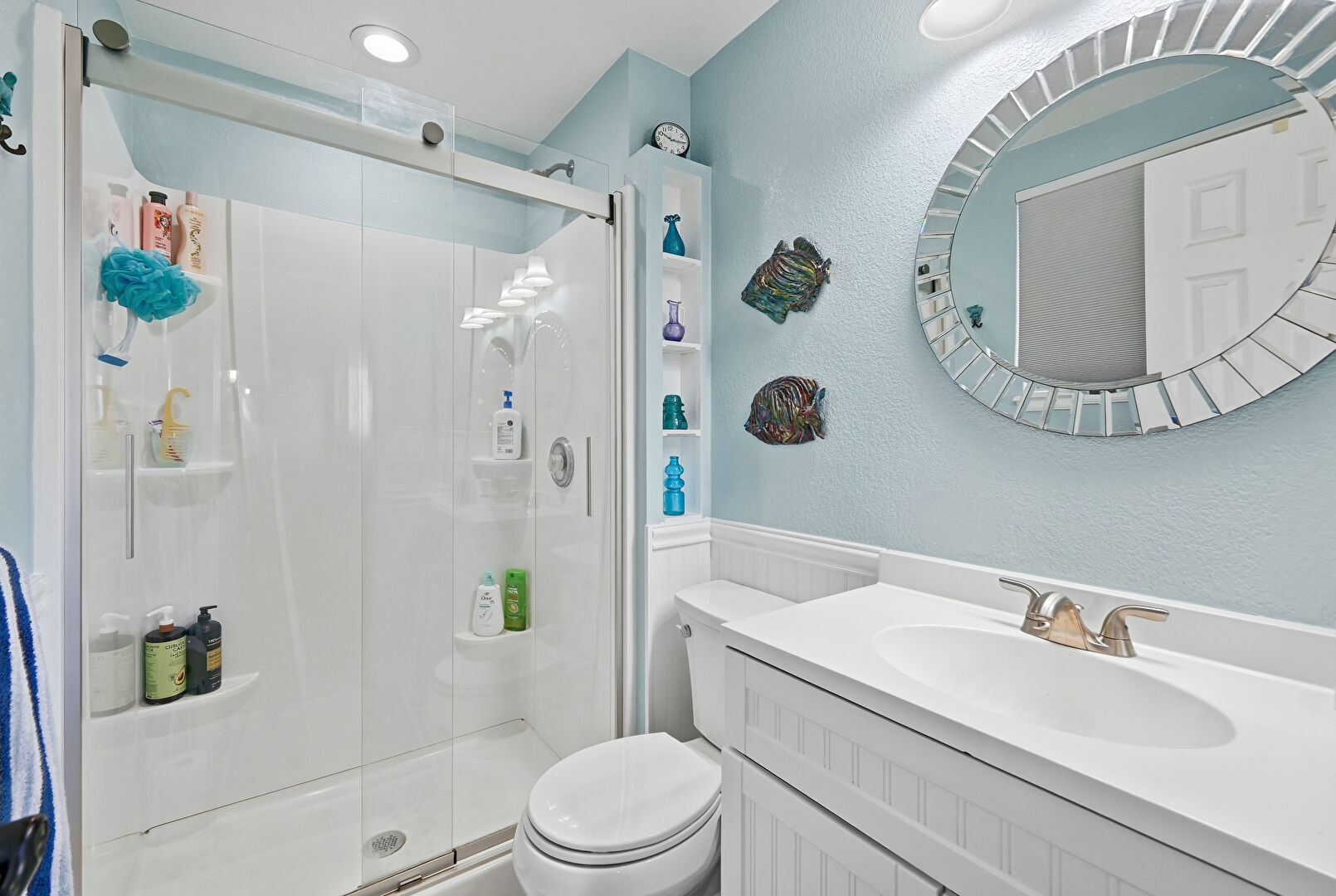 Full Bathroom, Recessed Lighting, Textured Wall, Tile Floor, Vanity, Vent, Wainscot Wall, Wood Finish Floor, Full Bathroom, Textured Wall, Tile Wall