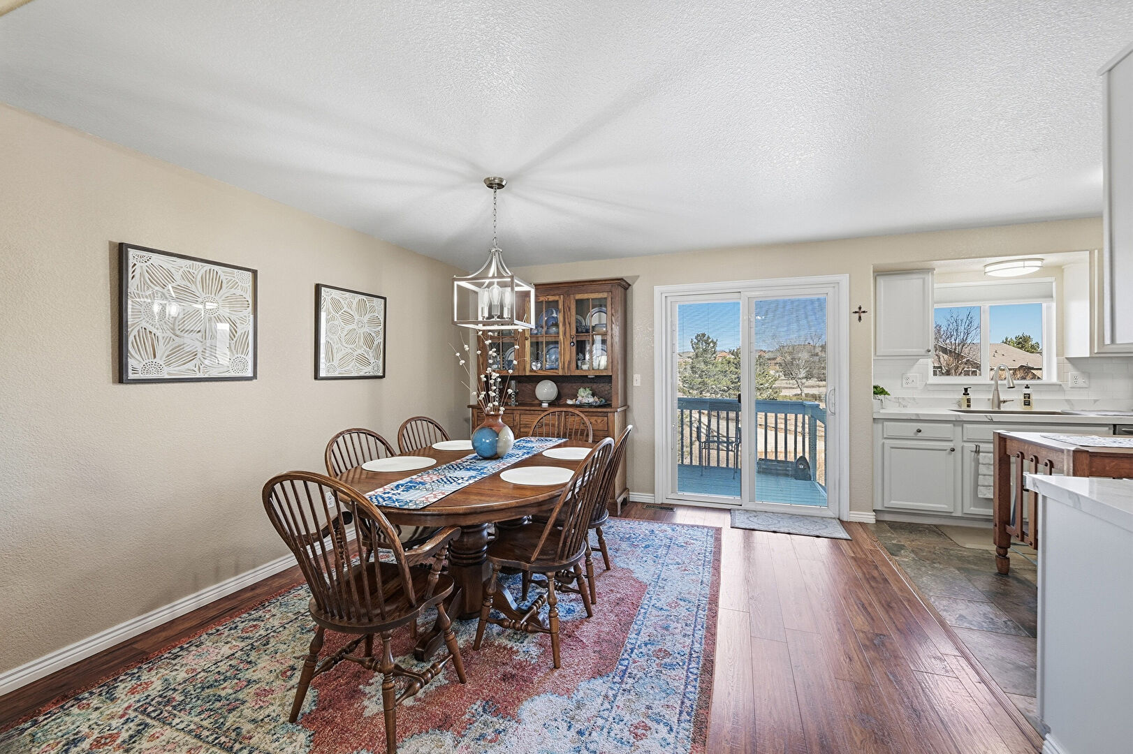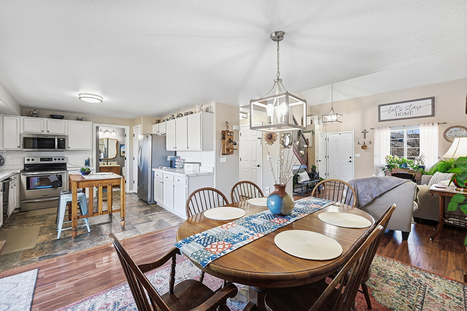 Baseboards Wall, Drywall, Natural Light, Notable Chandelier, Smoke Carbon Monoxide Detector, Stone Finish Floor, Textured Ceiling, U Shaped Kitchen, Vaulted Ceiling, Wood Finish Floor, Baseboards Wall, Natural Light, Notable Chandelier, Smoke Carbon Monoxide Detector, Wood Finish Floor