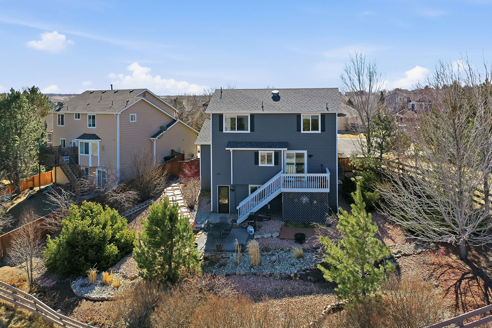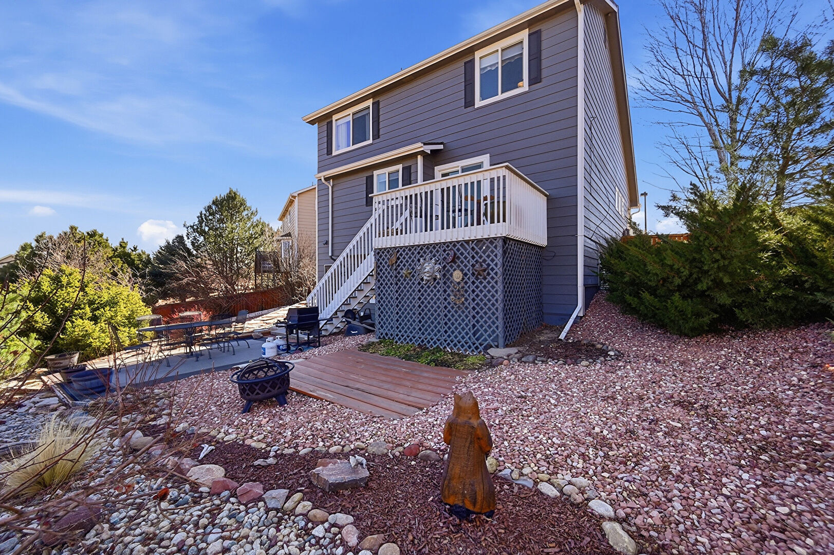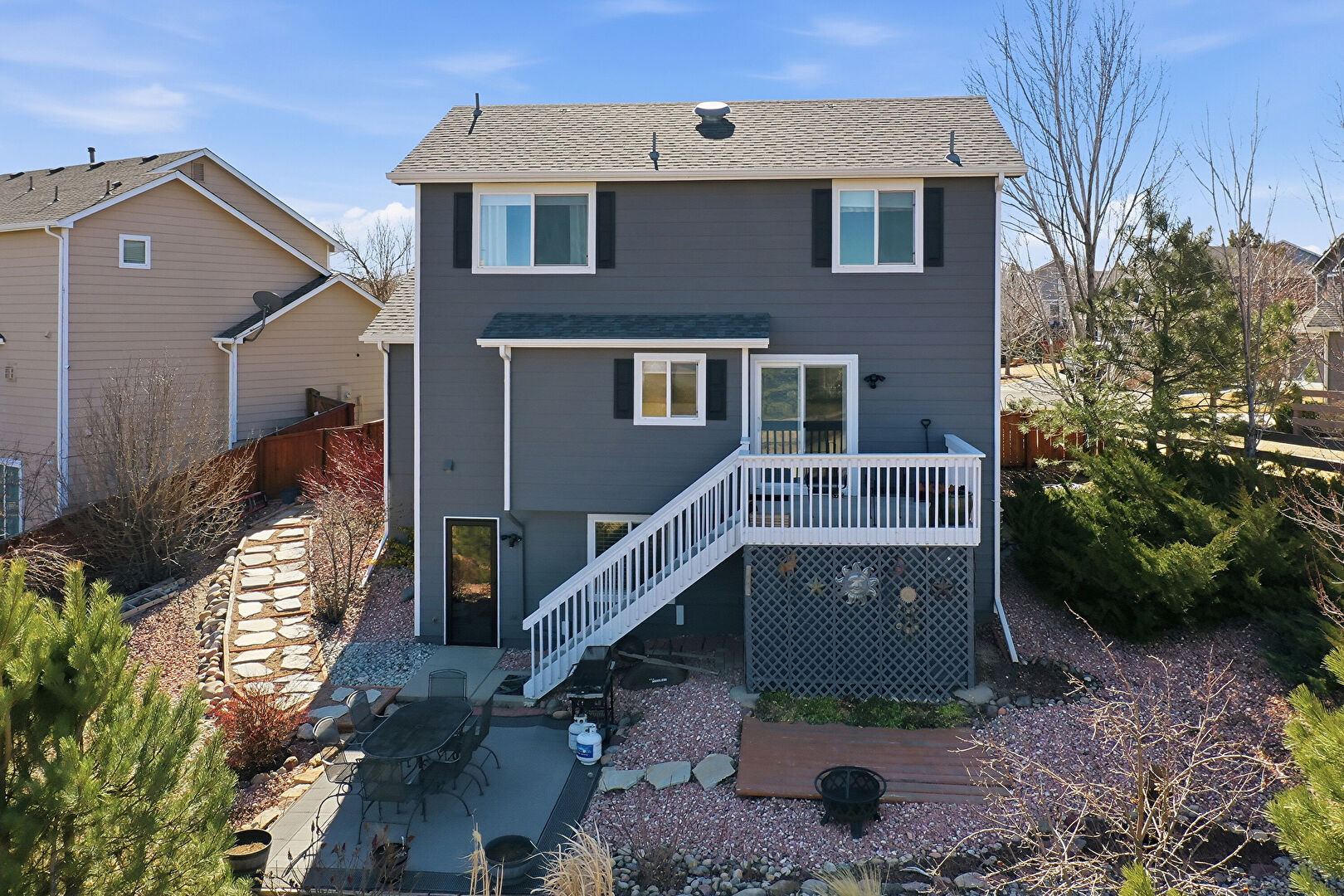 Deck, Downspout, Fence, Fire Pit, Gutters, Horizontal Siding, Outdoor Dining Area, Patio, Residential View, Shingle Roof, Stairs, Stucco Siding, Deck, Grill, Horizontal Siding, Stairs