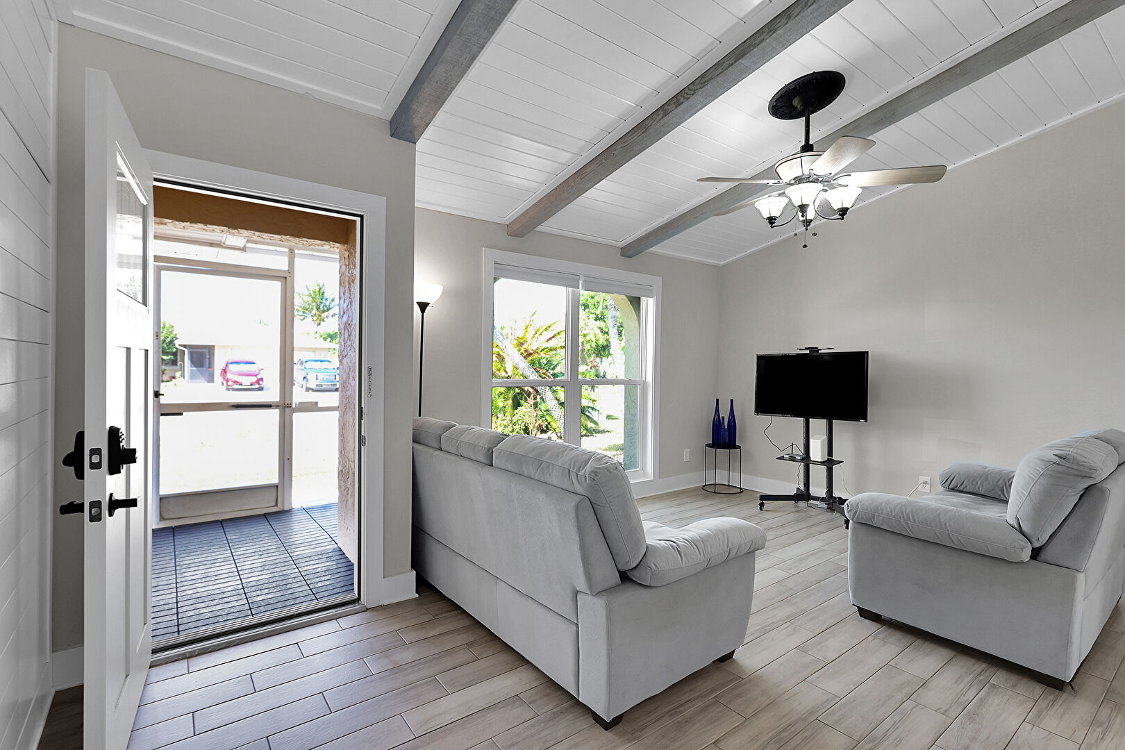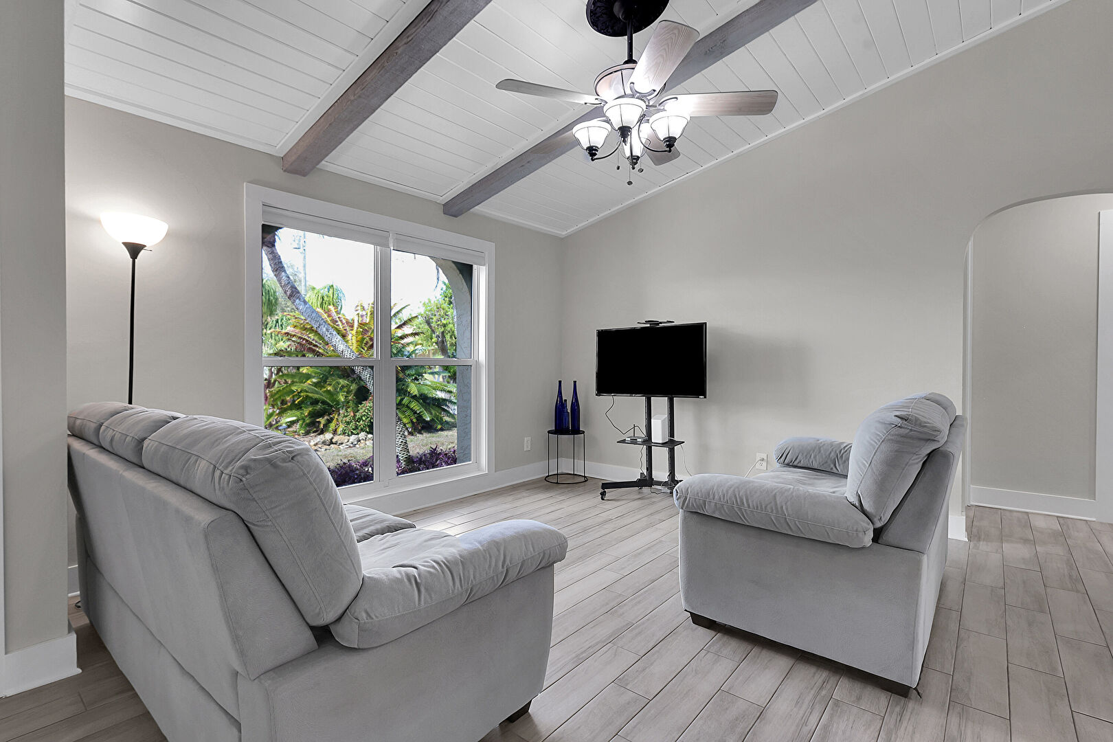 Accent Wall, Arched Walkways, Baseboards Wall, Beamed Ceiling, Ceiling Fan, Drywall, Natural Light, Recessed Lighting, Vaulted Ceiling, Vent, Wood Ceiling, Wood Finish Floor, Beamed Ceiling, Ceiling Fan, Wood Ceiling, Wood Wall