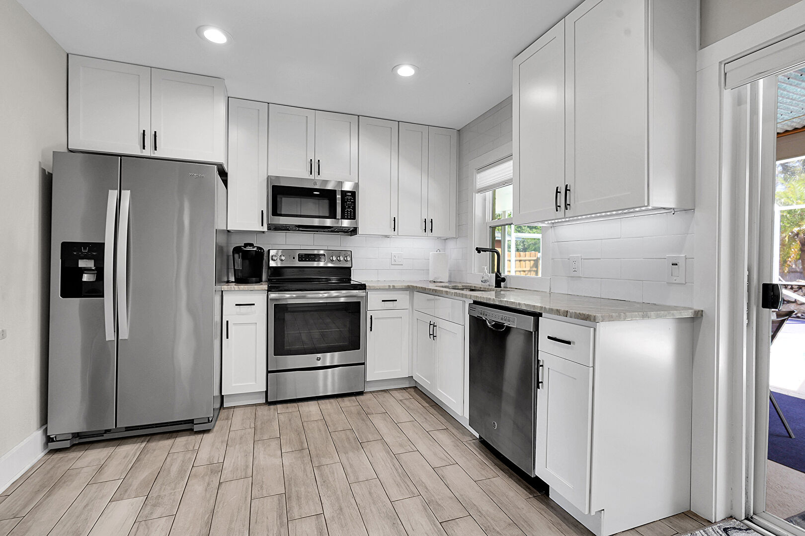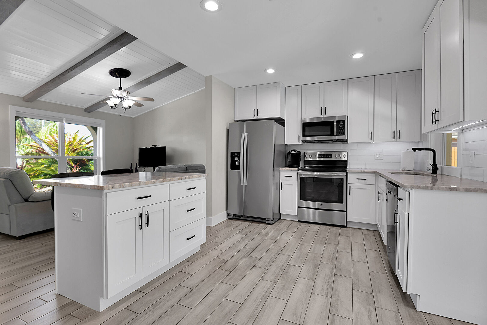 Arched Walkways, Baseboards Wall, Beamed Ceiling, Ceiling Fan, Drywall, Kitchen Bar, Kitchen Island, L Shaped Kitchen, Natural Light, Opens To Living Area, Recessed Lighting, Shaker Cabinets, Stone Countertops, Vaulted Ceiling, Vent, Wood Finish Floor, Wood Wall, Shaker Cabinets, Stone Countertops, Wood Ceiling, Wood Finish Floor
