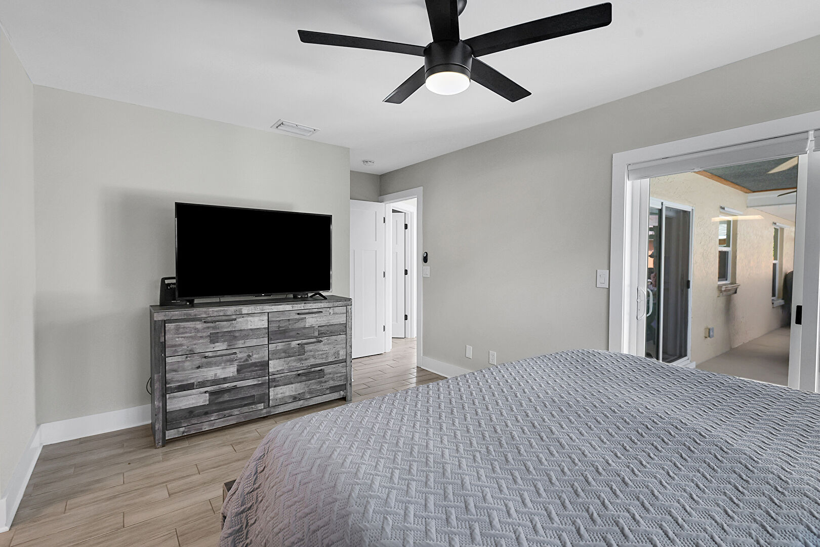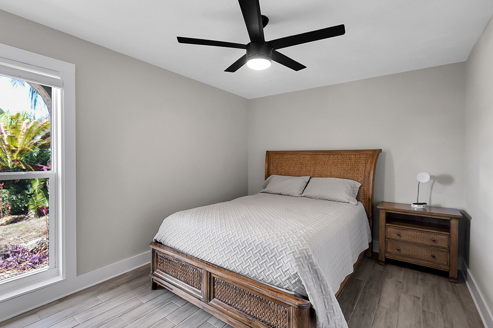 Access To Exterior, Arched Walkways, Baseboards Wall, Ceiling Fan, Drywall, Ensuite Bathroom, Natural Light, Wood Finish Floor, Ceiling Fan, Drywall
