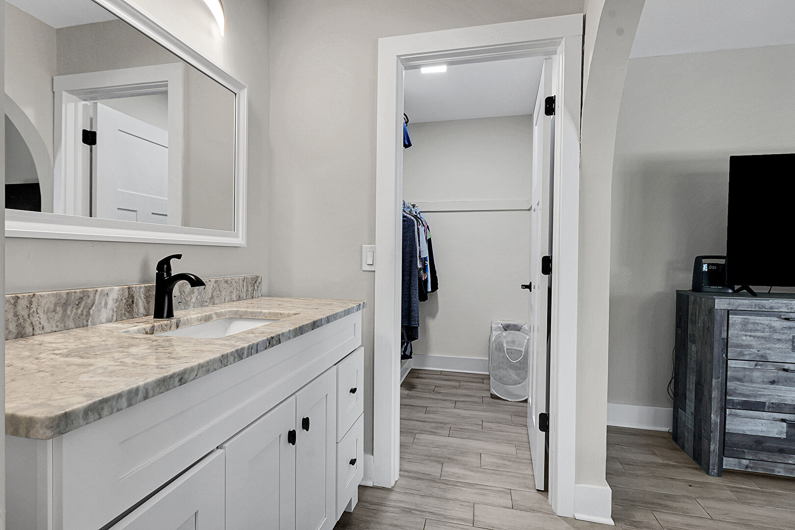 Drywall, Ensuite Bathroom, Full Bathroom, Natural Light, Vanity, Walk In Closet, Wood Finish Floor, Baseboards Wall, Ceiling Fan, Full Bathroom, Recessed Lighting
