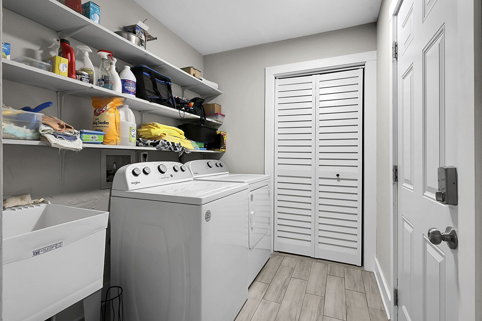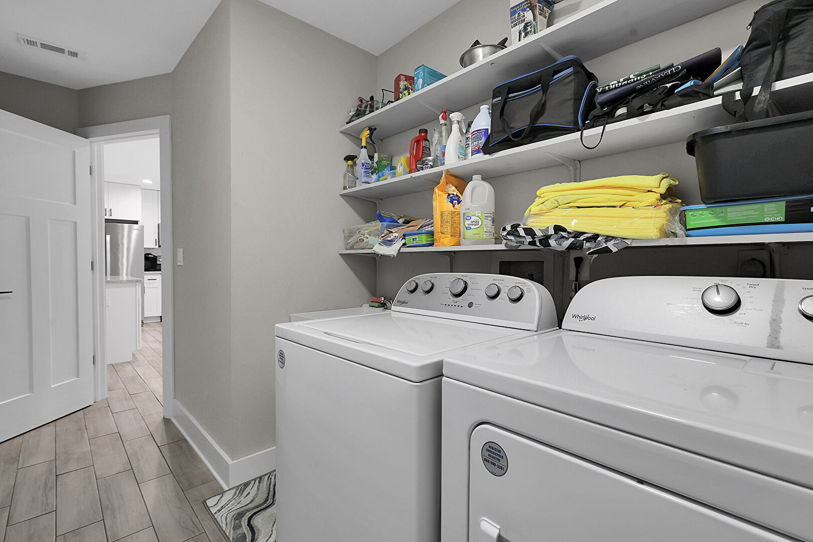 Drywall, Laundry, Vent, Washer Hookup, Wood Finish Floor, Baseboards Wall