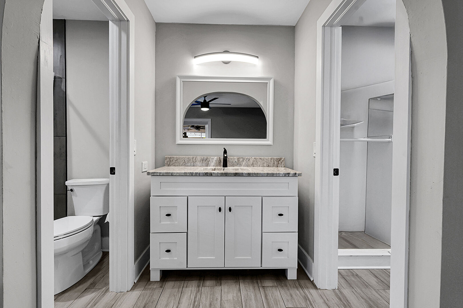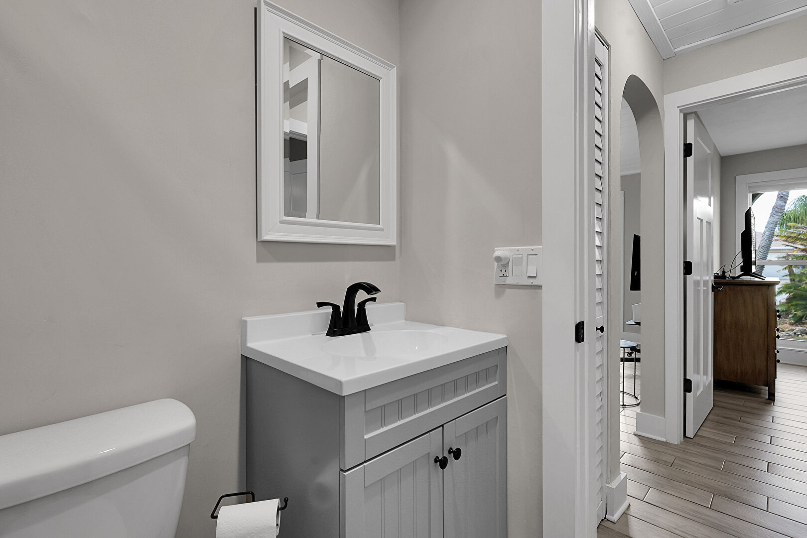 Baseboards Wall, Drywall, Half Bathroom, Natural Light, Vanity, Full Bathroom, Wood Finish Floor