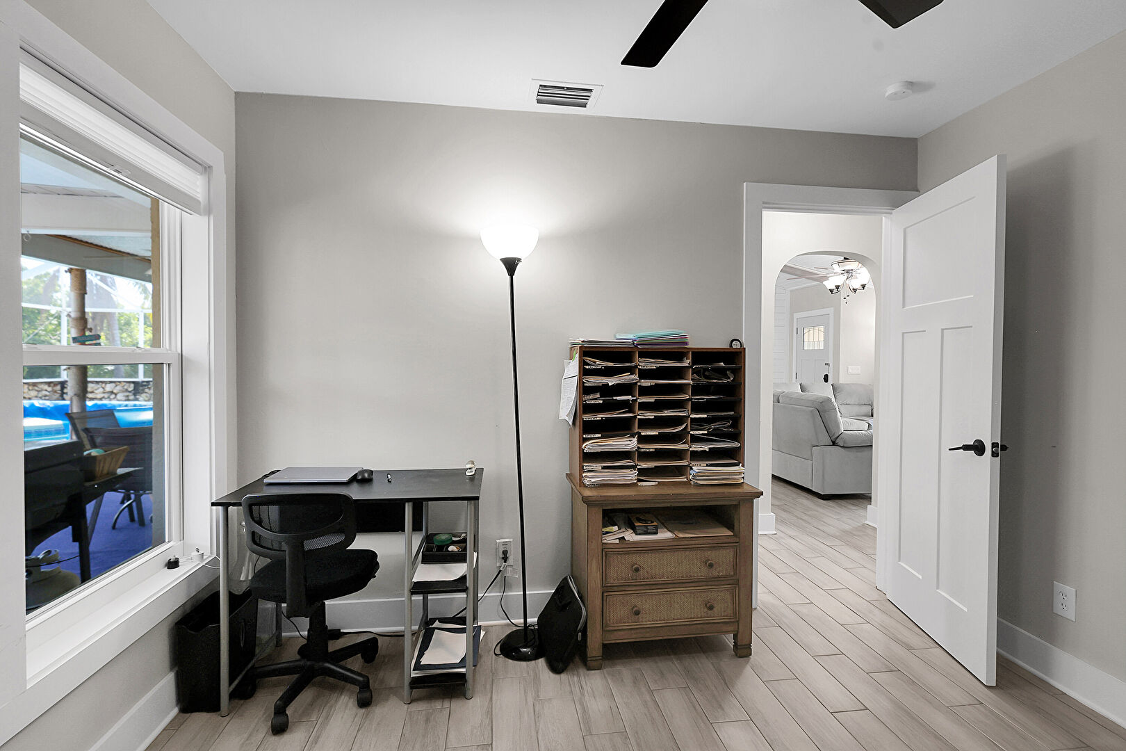 Arched Walkways, Baseboards Wall, Ceiling Fan, Drywall, Natural Light, Office Area, Vent, Wood Finish Floor, Baseboards Wall, Smoke Carbon Monoxide Detector