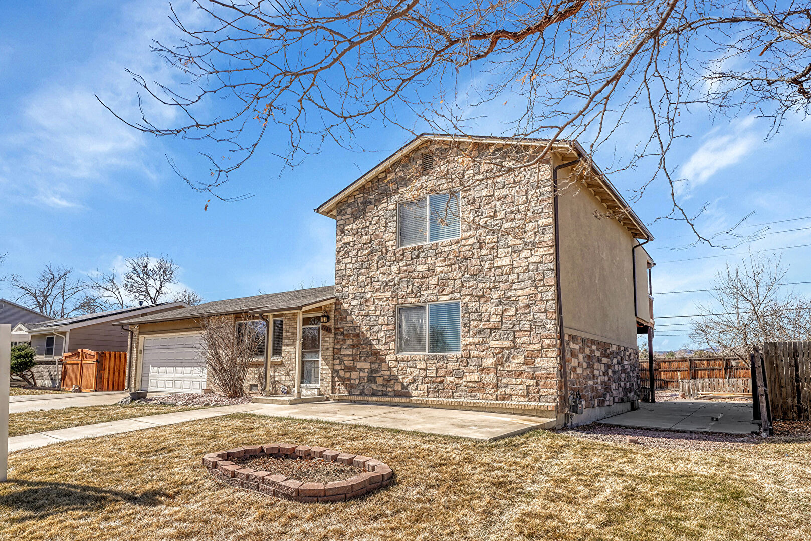 Brick Siding, Concrete Foundation, Downspout, Driveway, Fence, Gate, Gutters, Lawn, Parking Pad, Patio, Porch, Shingle Roof, Stone Siding, Driveway, Gutters