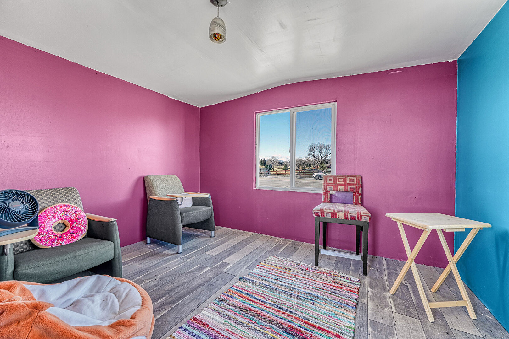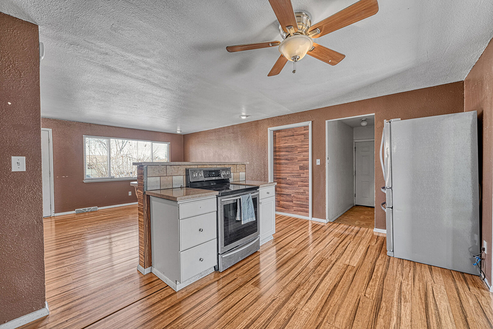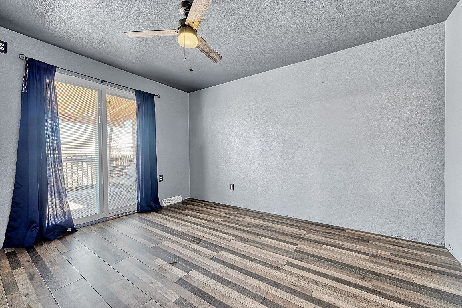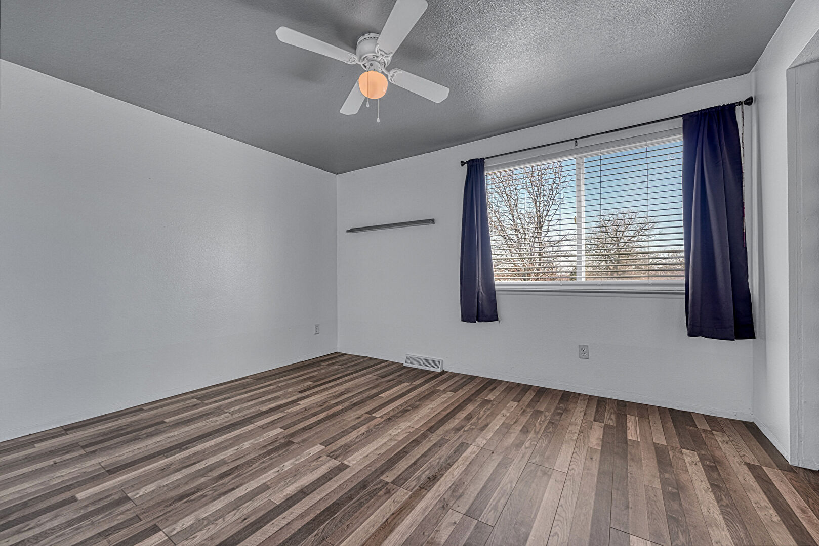 Natural Light, Textured Ceiling, Textured Wall, Vent, Wood Finish Floor, Ceiling Fan