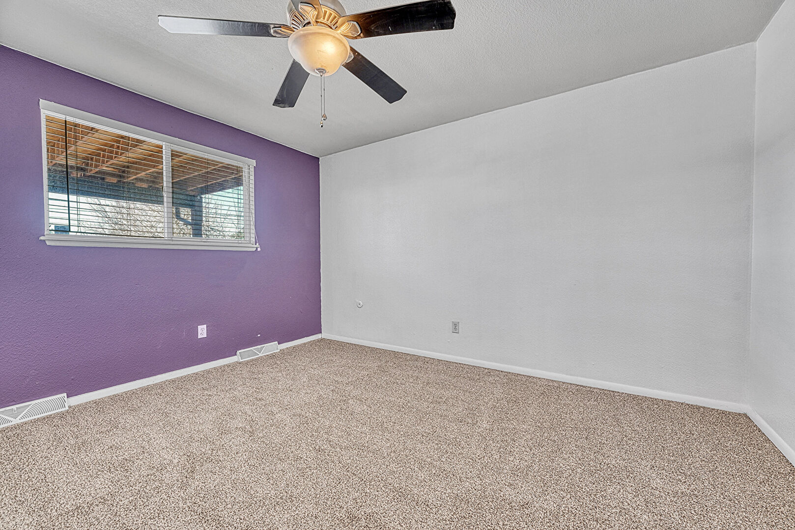 Baseboards Wall, Carpet, Ceiling Fan, Drywall, Natural Light, Textured Ceiling, Vent, Wood Finish Floor, Baseboards Wall, Ceiling Fan, Natural Light