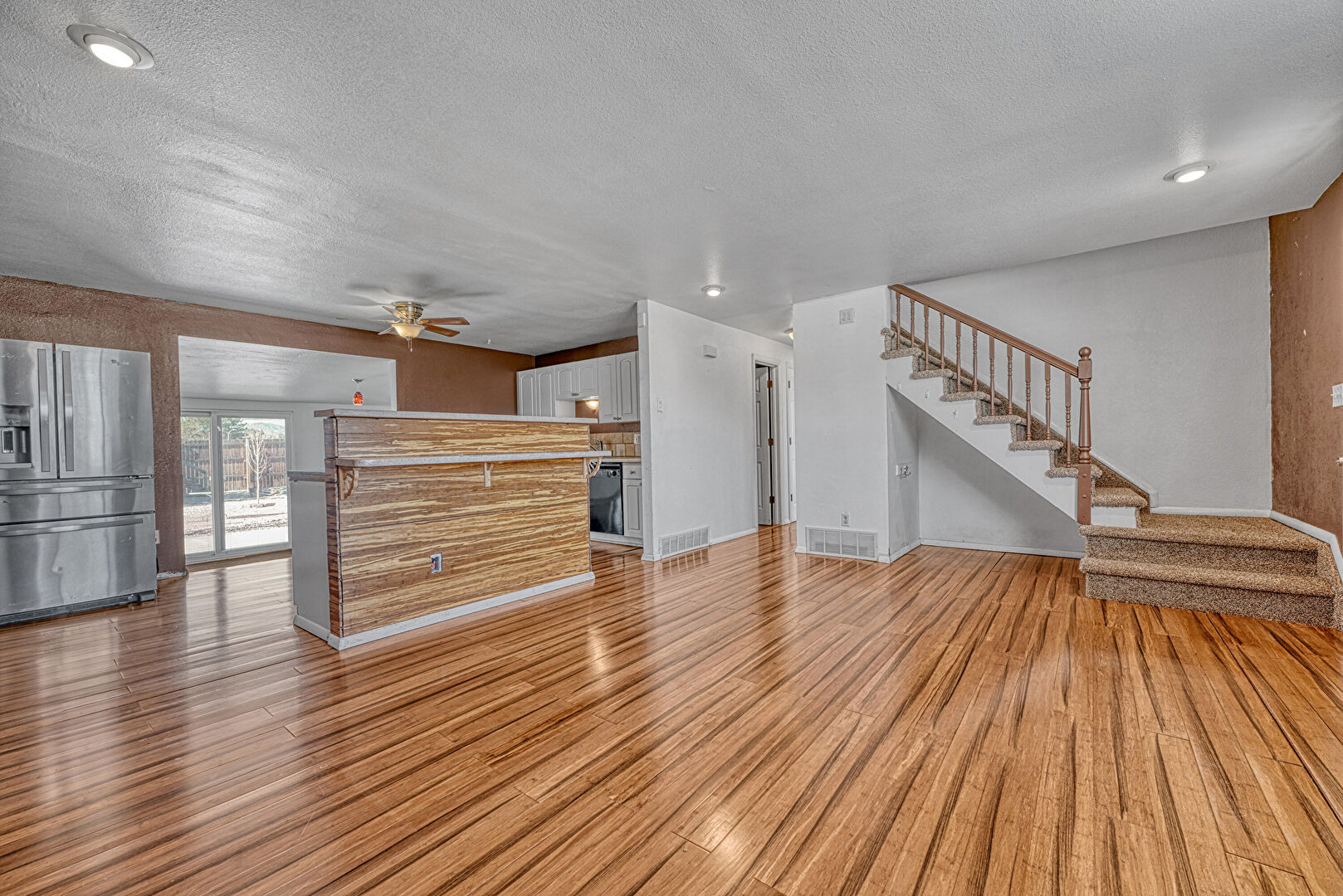 Baseboards Wall, Ceiling Fan, Natural Light, Recessed Lighting, Stairs, Textured Ceiling, Textured Wall, Vent, Wood Finish Floor, Baseboards Wall, Drywall, Wood Finish Floor