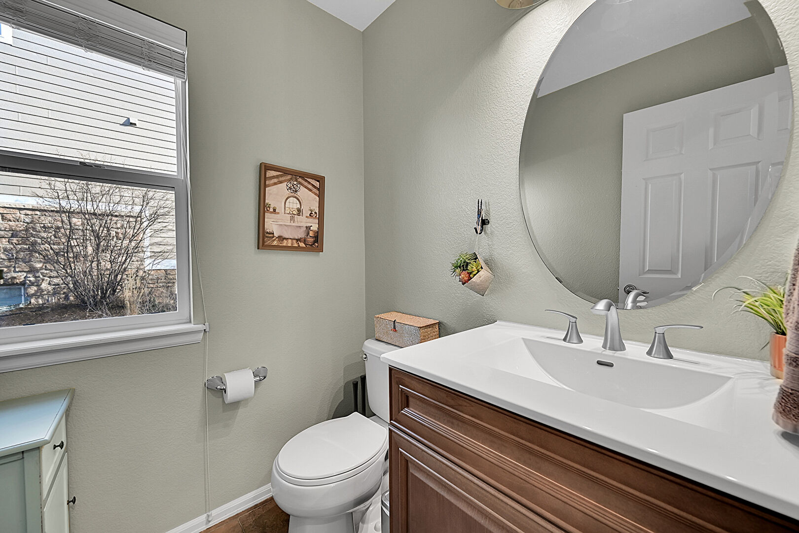 Baseboards Wall, Combined Bath Shower, Double Vanity, Full Bathroom, Half Bathroom, Natural Light, Notable Chandelier, Textured Wall, Vanity, Vent, Wood Finish Floor, Full Bathroom, Textured Wall