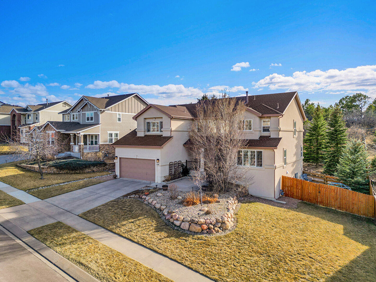Built In Garage, Downspout, Driveway, Fence, Lawn, Mountain View, Porch, Residential View, Shingle Roof, Stone Siding, Stucco Siding, Driveway, Fence, Mountain View, Residential View, Water View