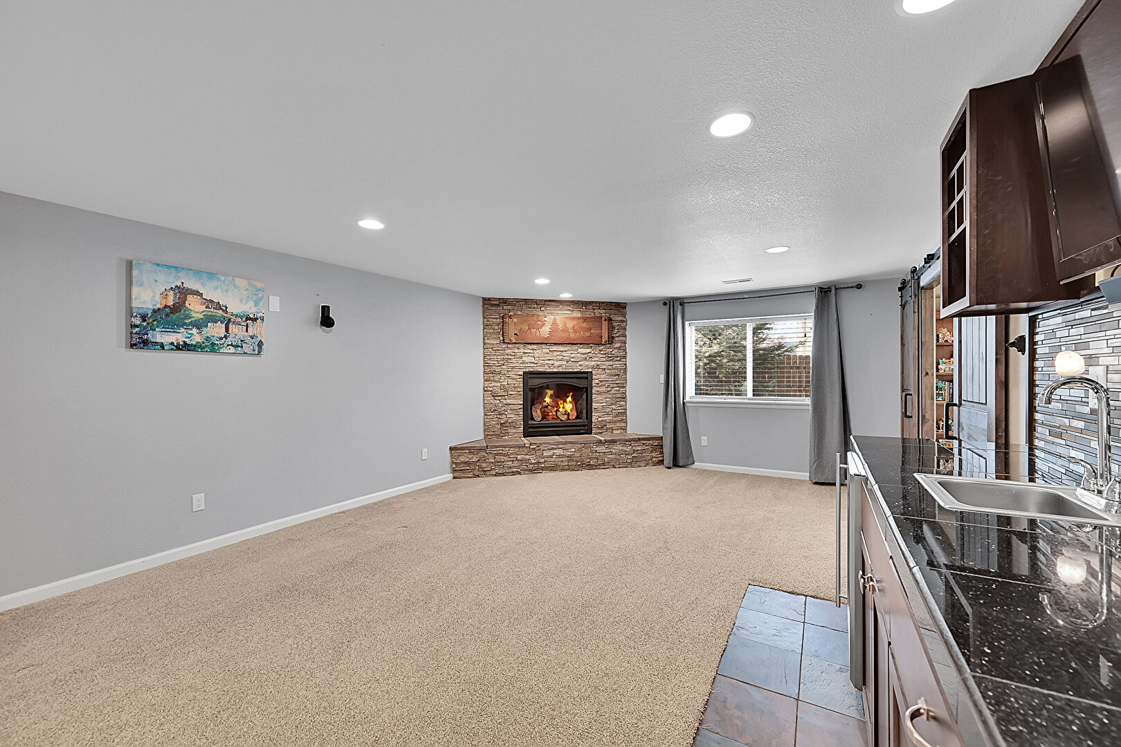 Barn Door, Baseboards Wall, Basement, Carpet, Drywall, Fireplace, Natural Light, Recessed Lighting, Stairs, Tile Floor, Carpet, Drywall, Fireplace