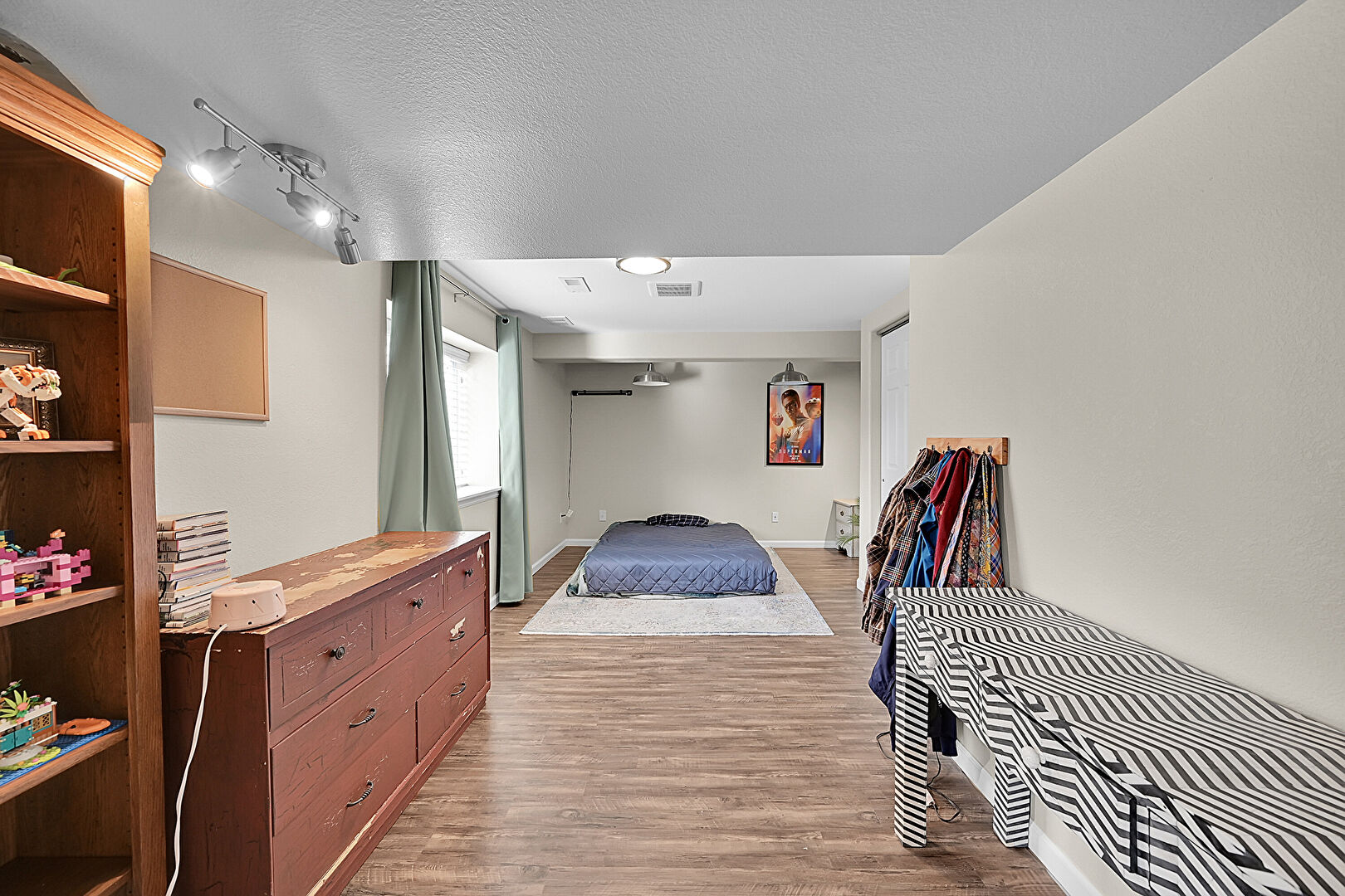 Baseboards Wall, Carpet, Drywall, Natural Light, Scuttle, Textured Ceiling, Track Lighting, Vent, Wood Finish Floor, Carpet, Natural Light, Vent