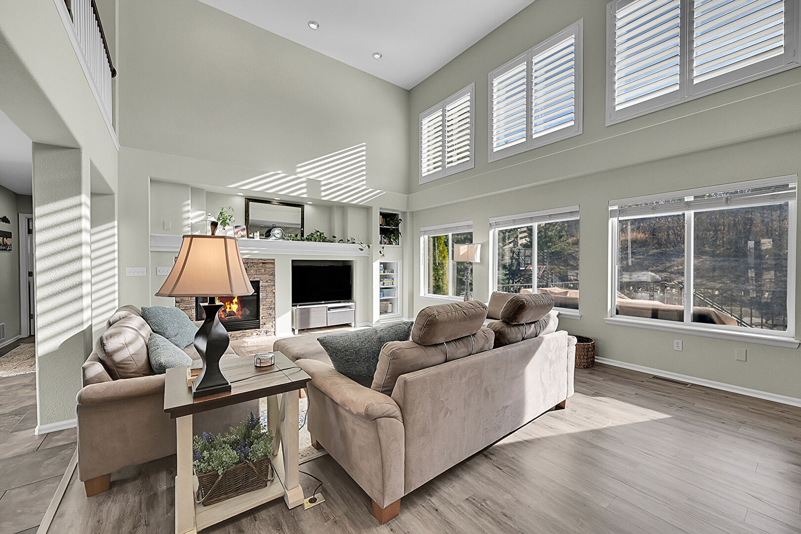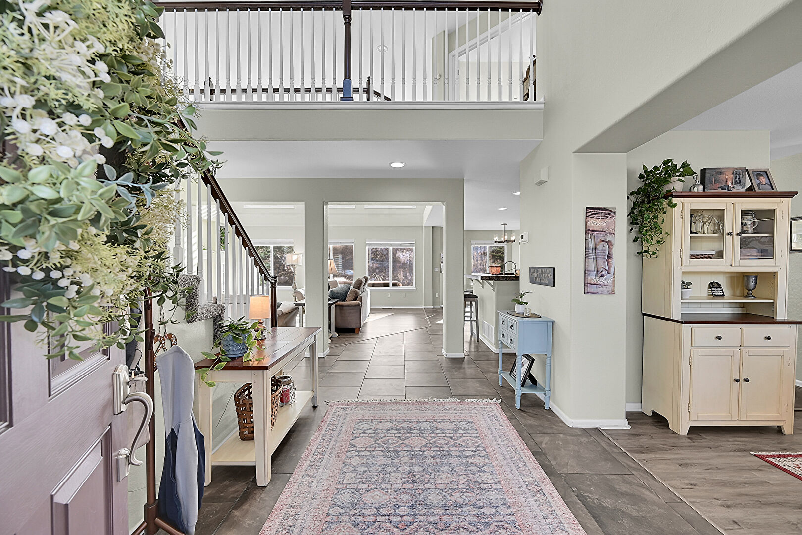 Baseboards Wall, Drywall, High Ceiling, Natural Light, Stairs, Tile Floor, Wood Finish Floor, Recessed Lighting