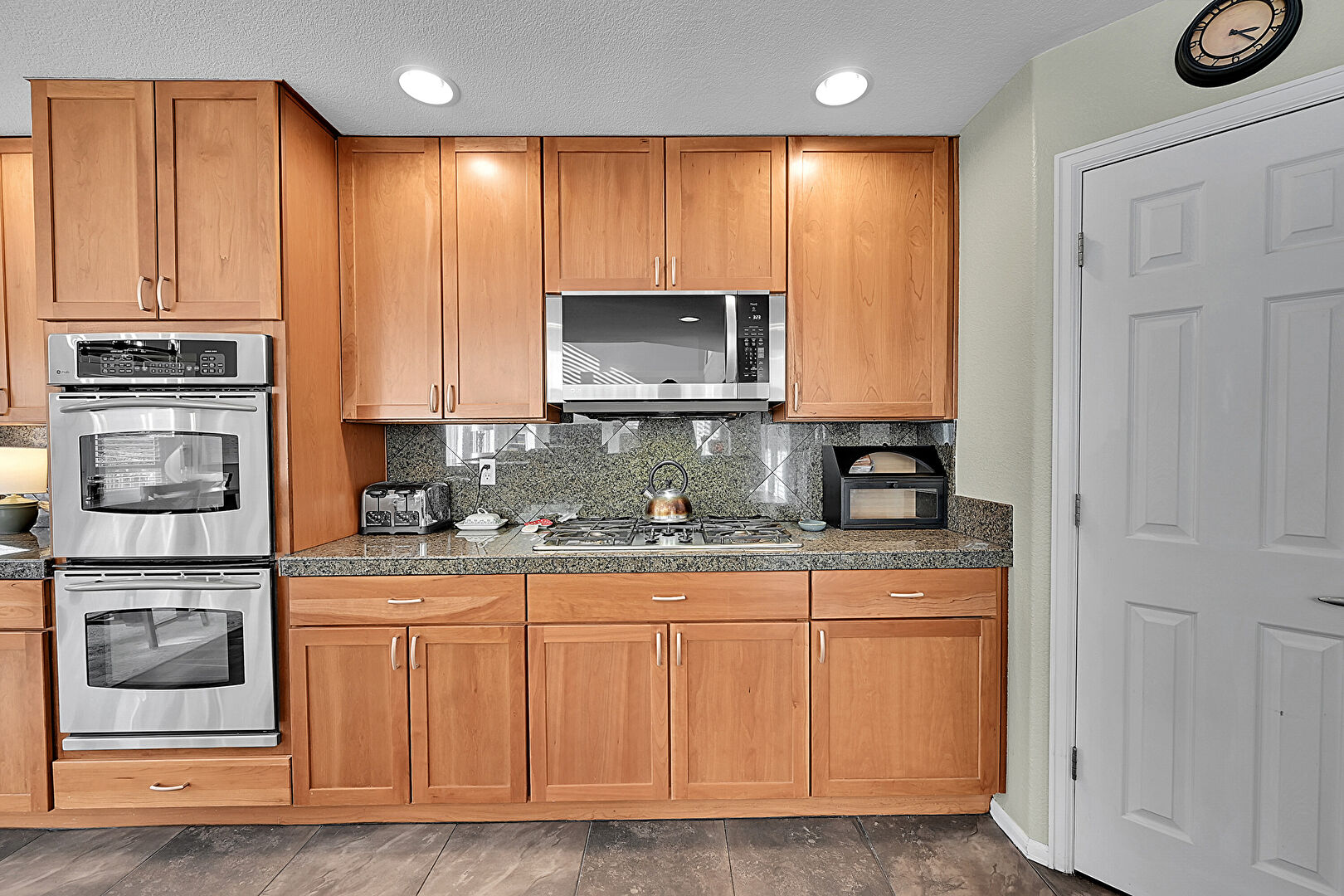 Baseboards Wall, Double Oven, Drywall, Fireplace, Kitchen Bar, Kitchen Island, L Shaped Kitchen, Medium Brown Cabinets, Multiple Kitchen Islands, Natural Light, Notable Chandelier, Opens To Living Area, Pendant Lighting, Recessed Lighting, Shaker Cabinets, Stone Tile Countertops, Textured Ceiling, Tile Floor, Toaster, Wood Finish Floor, Drywall, Recessed Lighting, Stone Tile Countertops