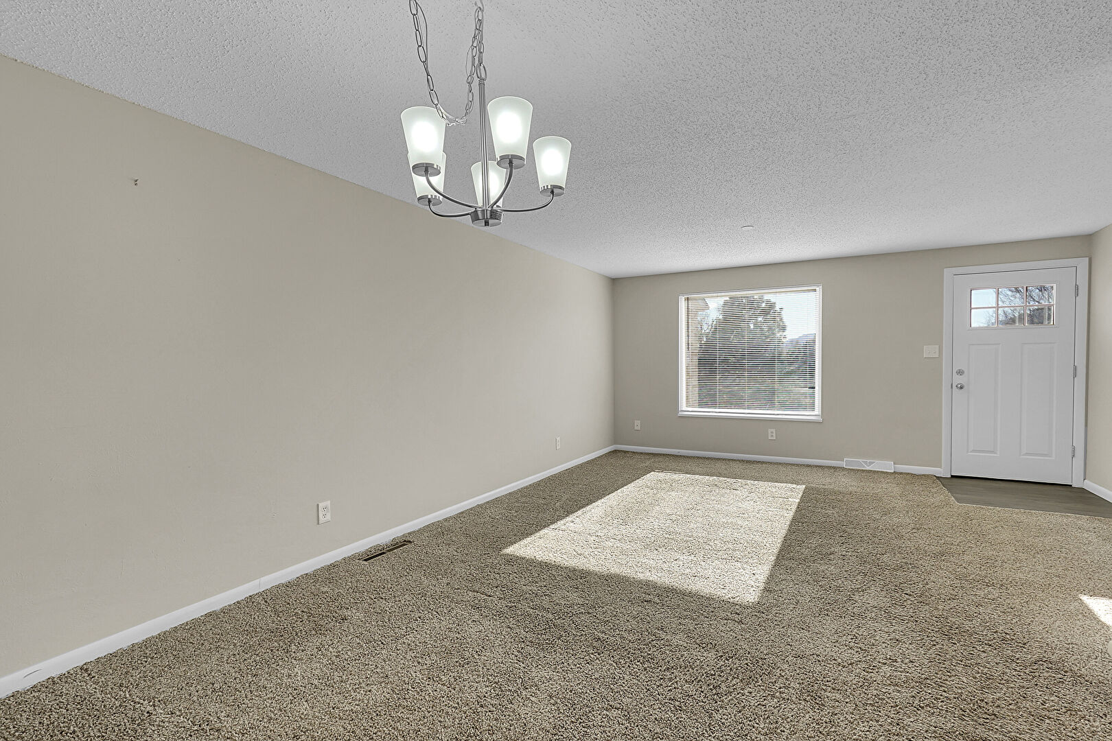 Baseboards Wall, Carpet, Drywall, Natural Light, Notable Chandelier, Textured Ceiling, Vent, Baseboards Wall, Notable Chandelier