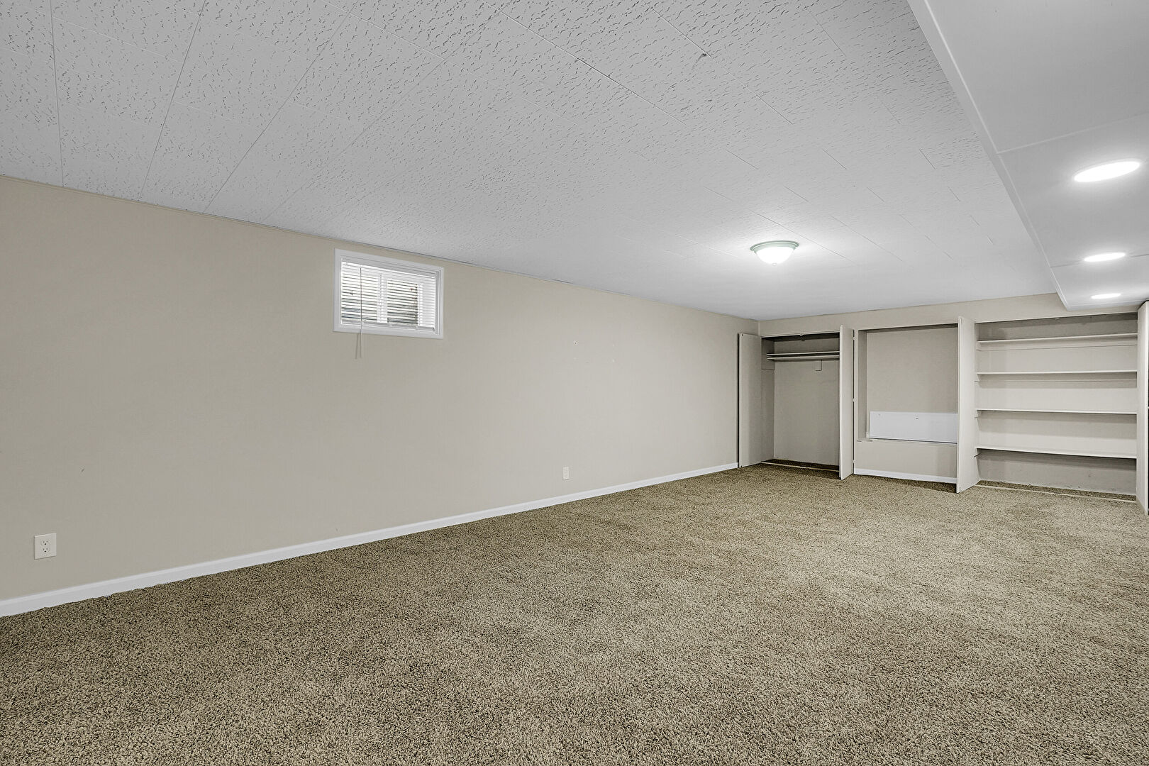 Baseboards Wall, Basement, Built In Shelves, Carpet, Drywall, Natural Light, Recessed Lighting, Stairs, Textured Ceiling, Vent, Baseboards Wall, Carpet, Stairs