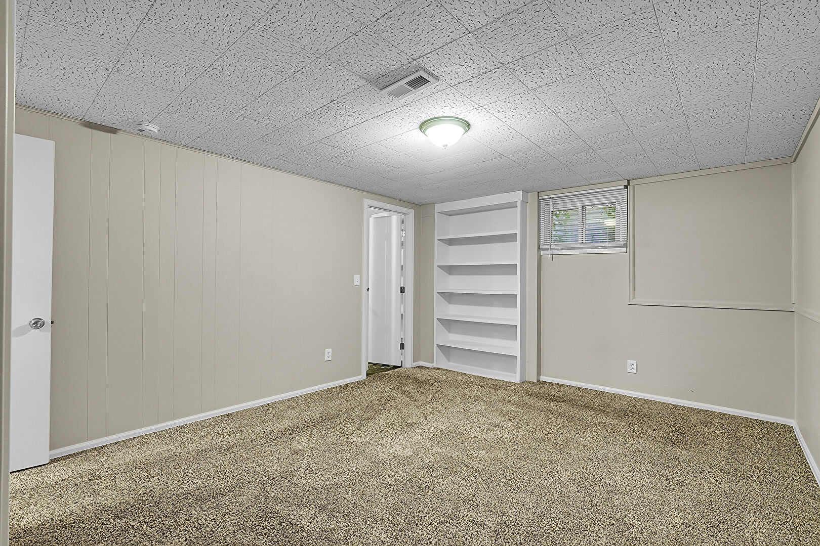Baseboards Wall, Basement, Built In Shelves, Carpet, Drywall, Natural Light, Smoke Carbon Monoxide Detector, Two Closets, Vent, Wood Wall, Basement, Vent