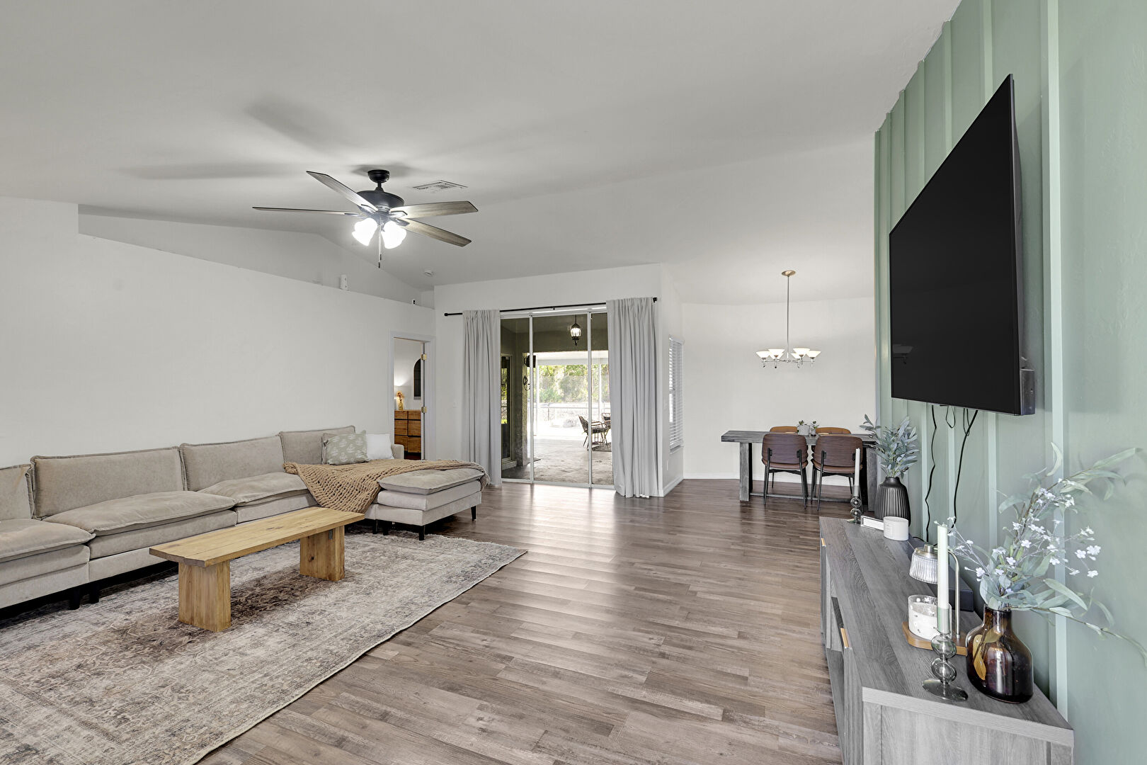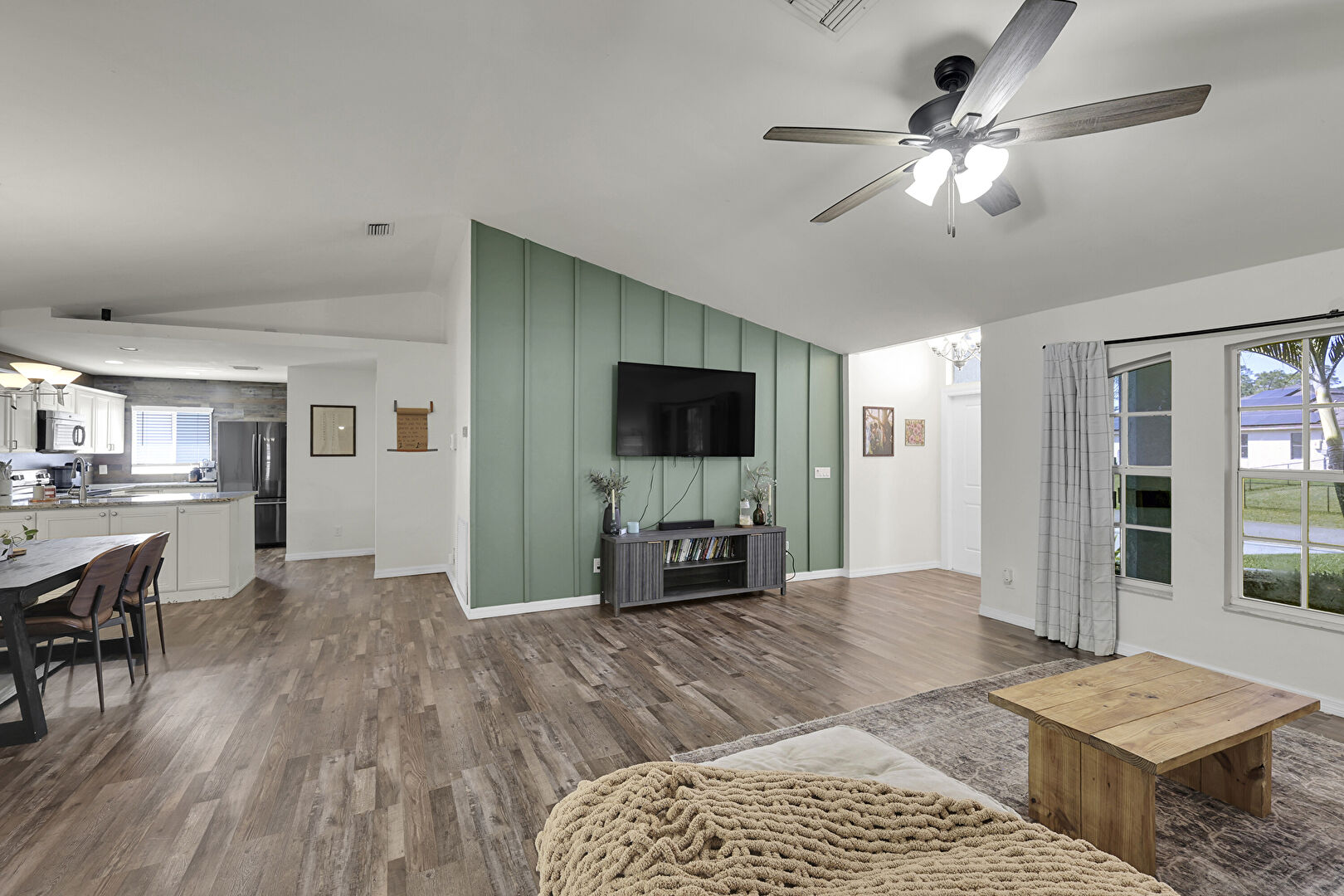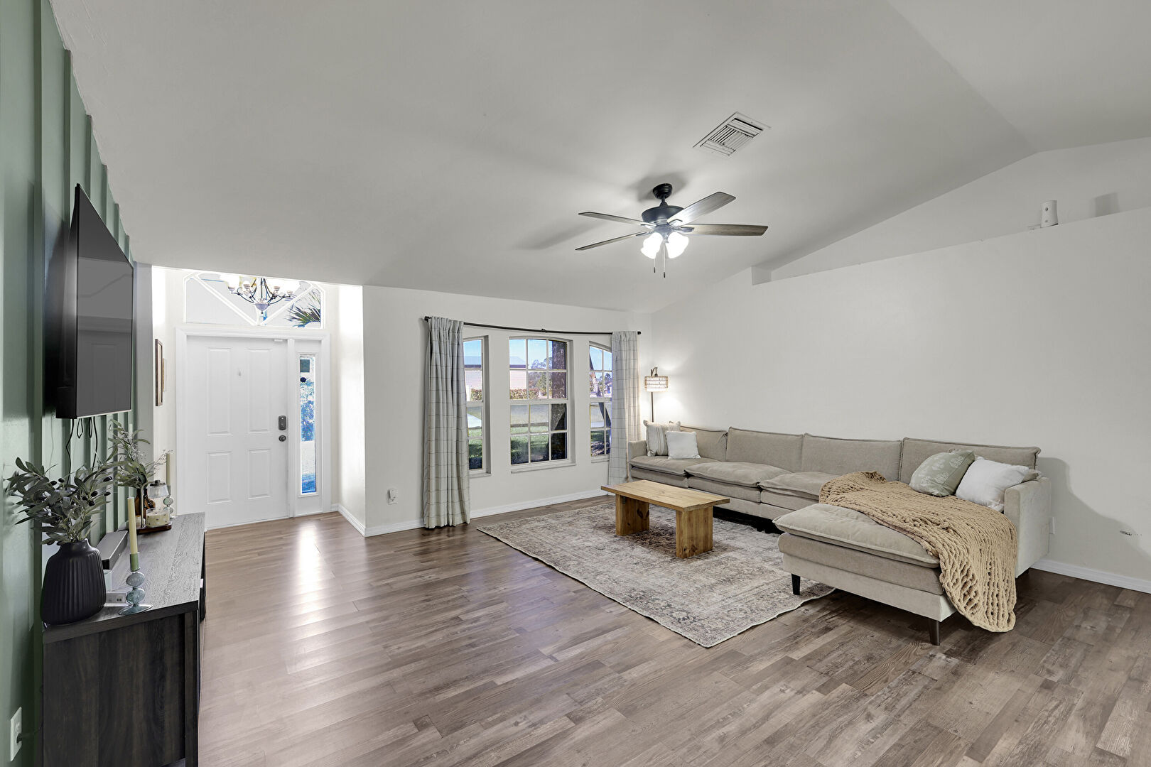 Baseboards Wall, Cathedral Ceiling, Ceiling Fan, Drywall, Natural Light, Vaulted Ceiling, Vent, Wood Finish Floor, Natural Light, Notable Chandelier, Vaulted Ceiling, Vent
