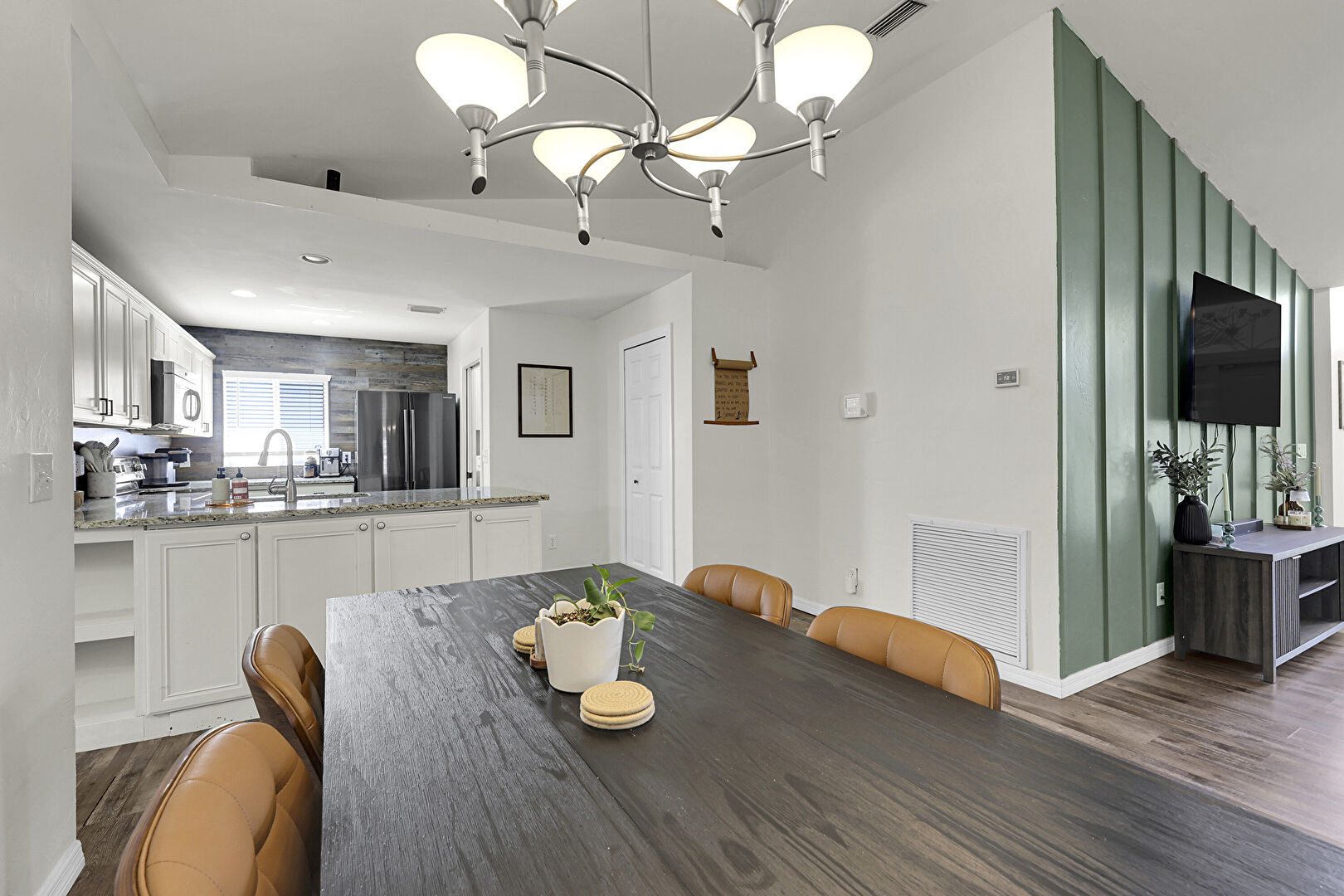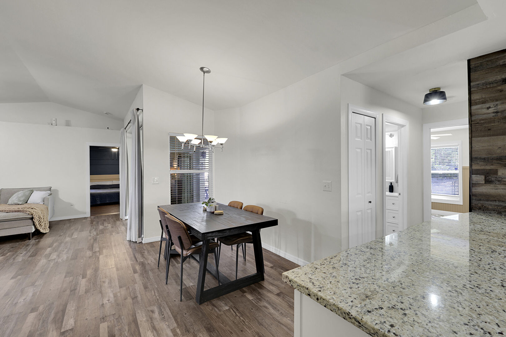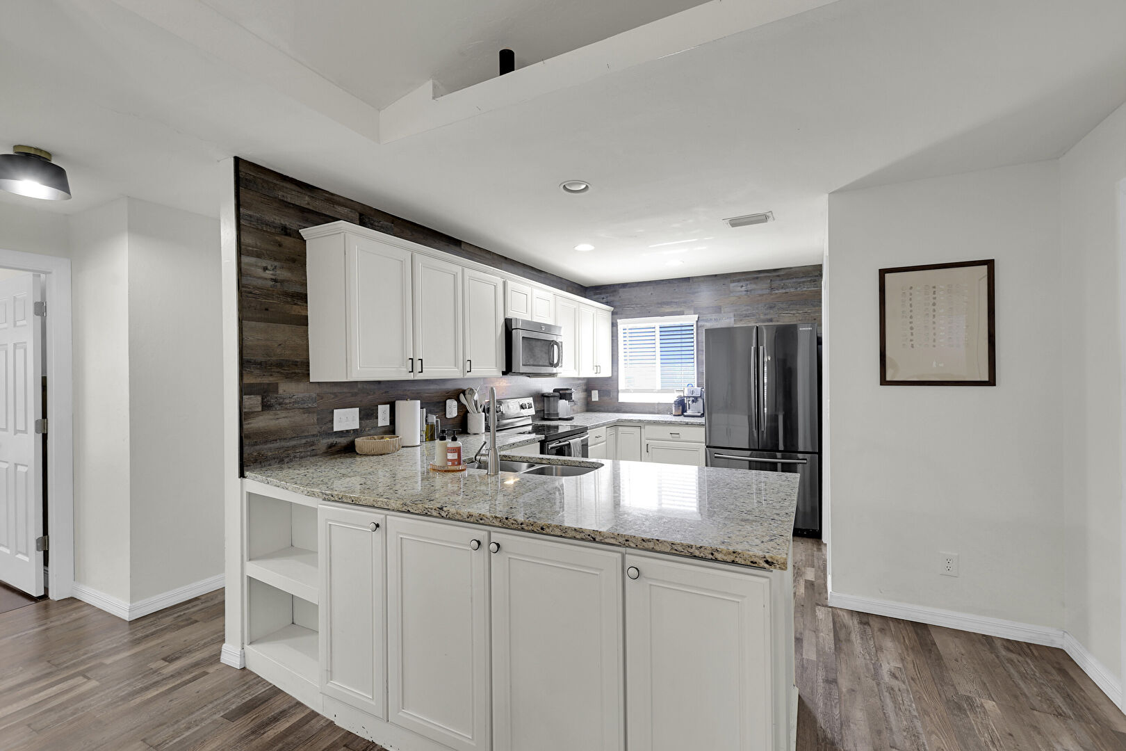 Accent Wall, Baseboards Wall, Crown Molding Cabinets, Drywall, Kitchen Peninsula, Laundry, Natural Light, Notable Chandelier, Open Shelves, Pendant Lighting, Recessed Lighting, Shaker Cabinets, Stone Countertops, U Shaped Kitchen, Vent, Wood Finish Floor, Wood Wall, Natural Light, Vaulted Ceiling, Vent, Wood Finish Floor