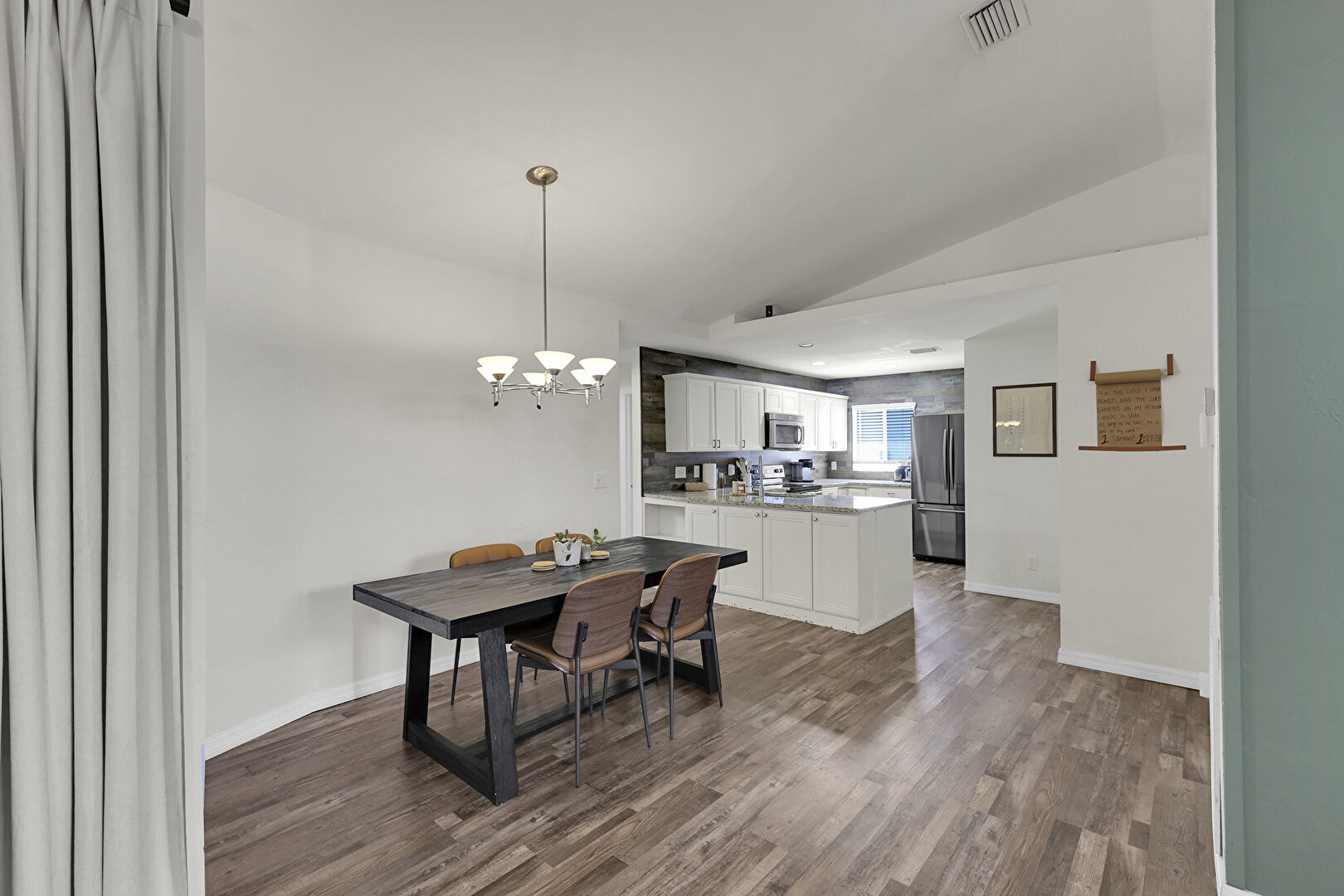 Baseboards Wall, Drywall, Natural Light, Notable Chandelier, Recessed Lighting, U Shaped Kitchen, Vaulted Ceiling, Vent, Wood Finish Floor, Baseboards Wall, Notable Chandelier, Vent