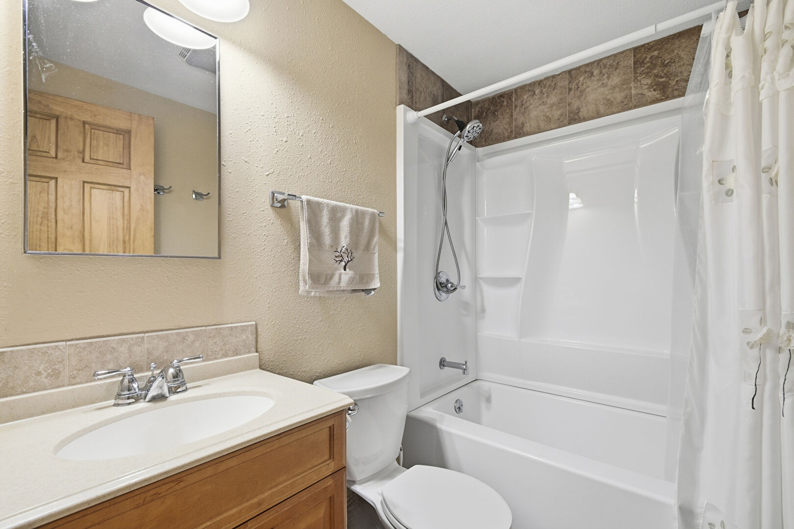 Combined Bath Shower, Full Bathroom, Textured Wall, Vanity, Textured Wall, Vent