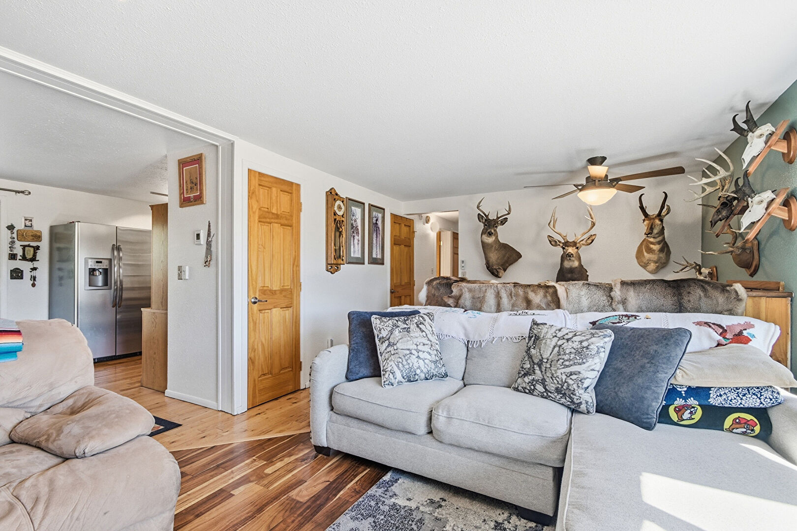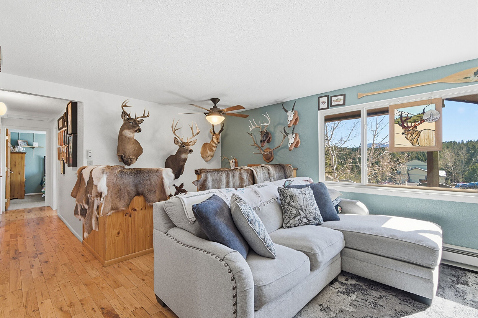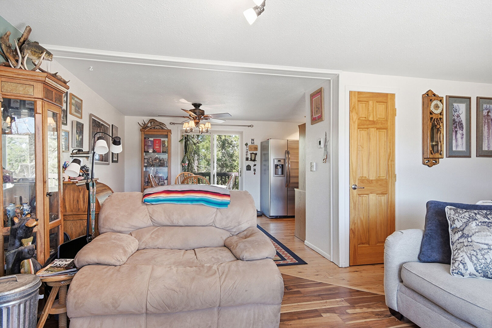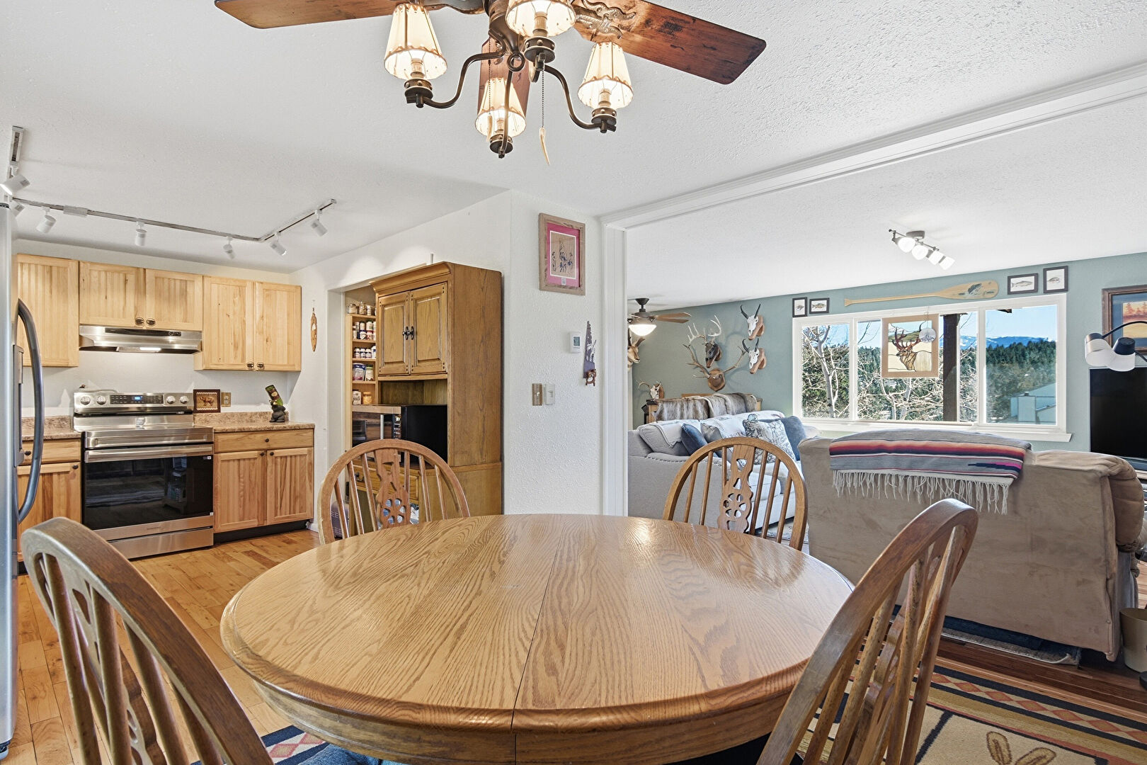 Baseboard Radiator, Baseboards Wall, Ceiling Fan, Drywall, Natural Light, Textured Ceiling, Track Lighting, Wood Finish Floor, Wood Stove, Baseboard Radiator, Baseboards Wall, Ceiling Fan, Natural Light
