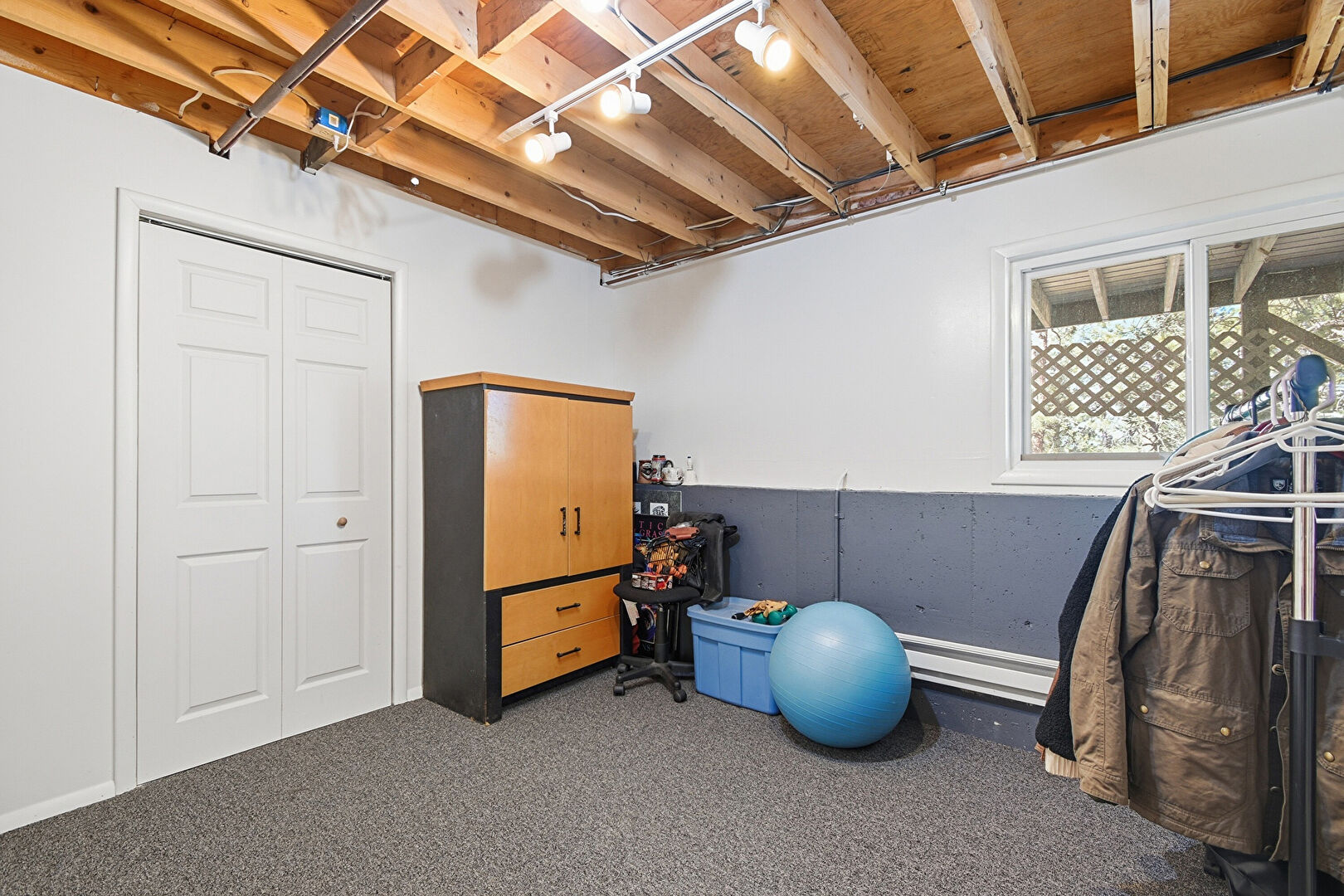 Baseboard Radiator, Baseboards Wall, Basement, Carpet, Drywall, Natural Light, Stairs, Track Lighting, Basement, Carpet