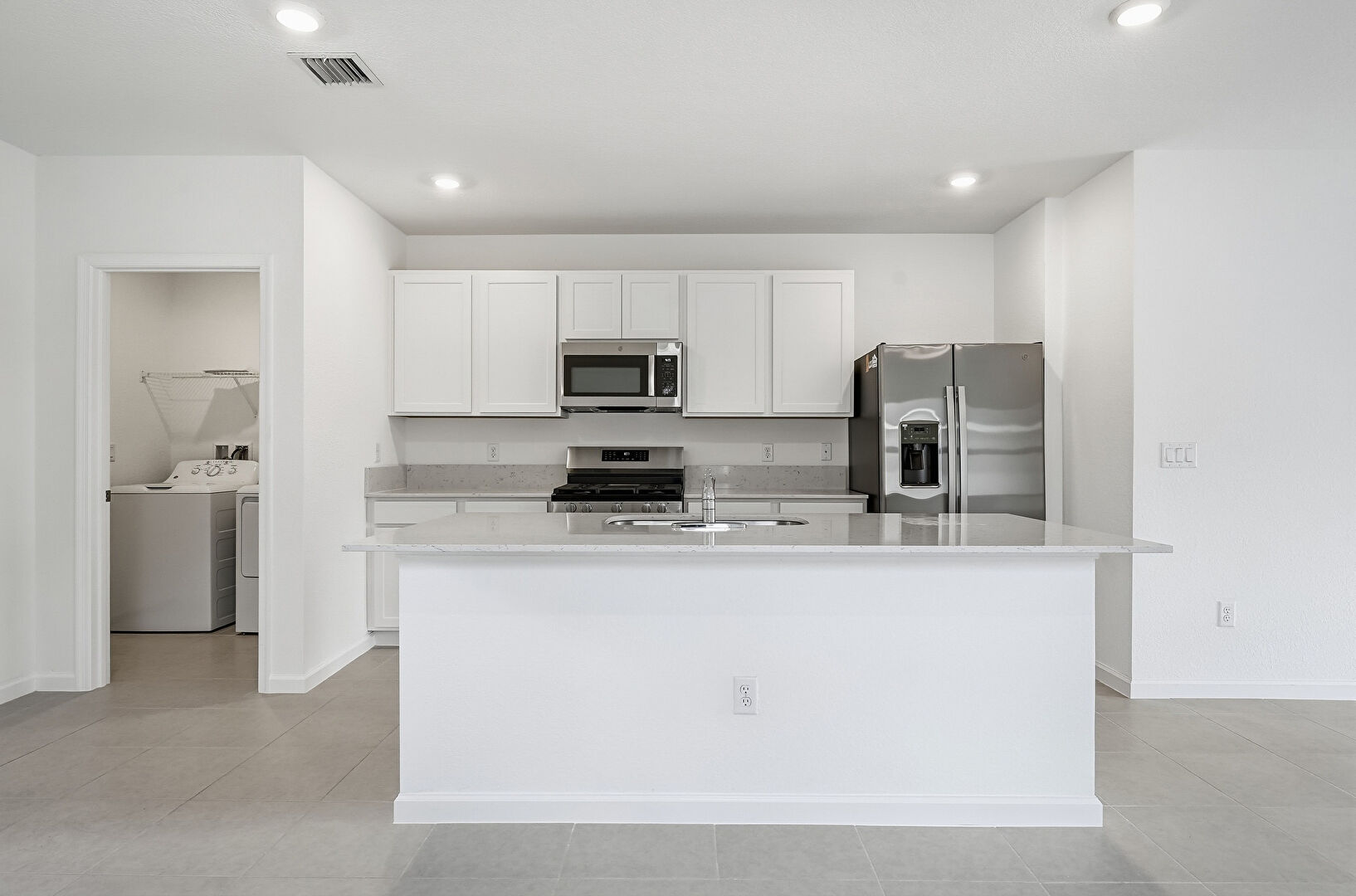 Baseboards Wall, Drywall, Kitchen Island, Laundry, Natural Light, One Wall Kitchen, Opens To Living Area, Recessed Lighting, Shaker Cabinets, Stone Countertops, Tile Floor, Vent, Washer Hookup, One Wall Kitchen, Stone Countertops, Vent