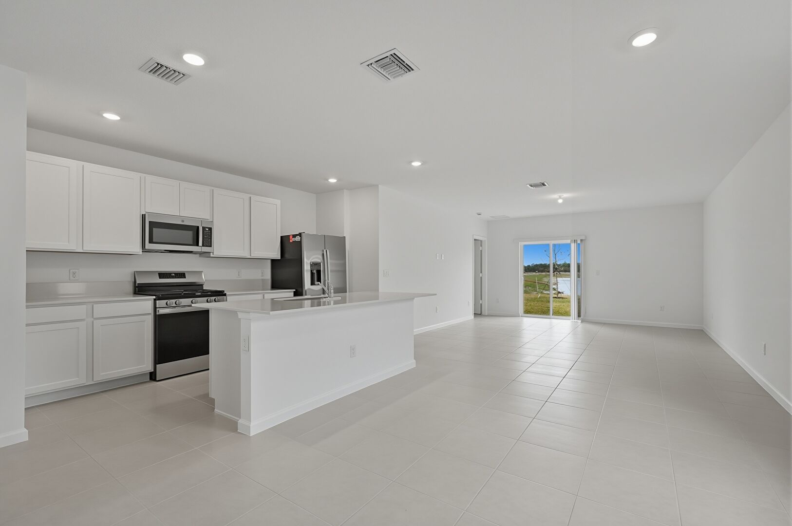 Baseboards Wall, Drywall, Natural Light, One Wall Kitchen, Recessed Lighting, Tile Floor, Vent, Water View, Baseboards Wall, Natural Light