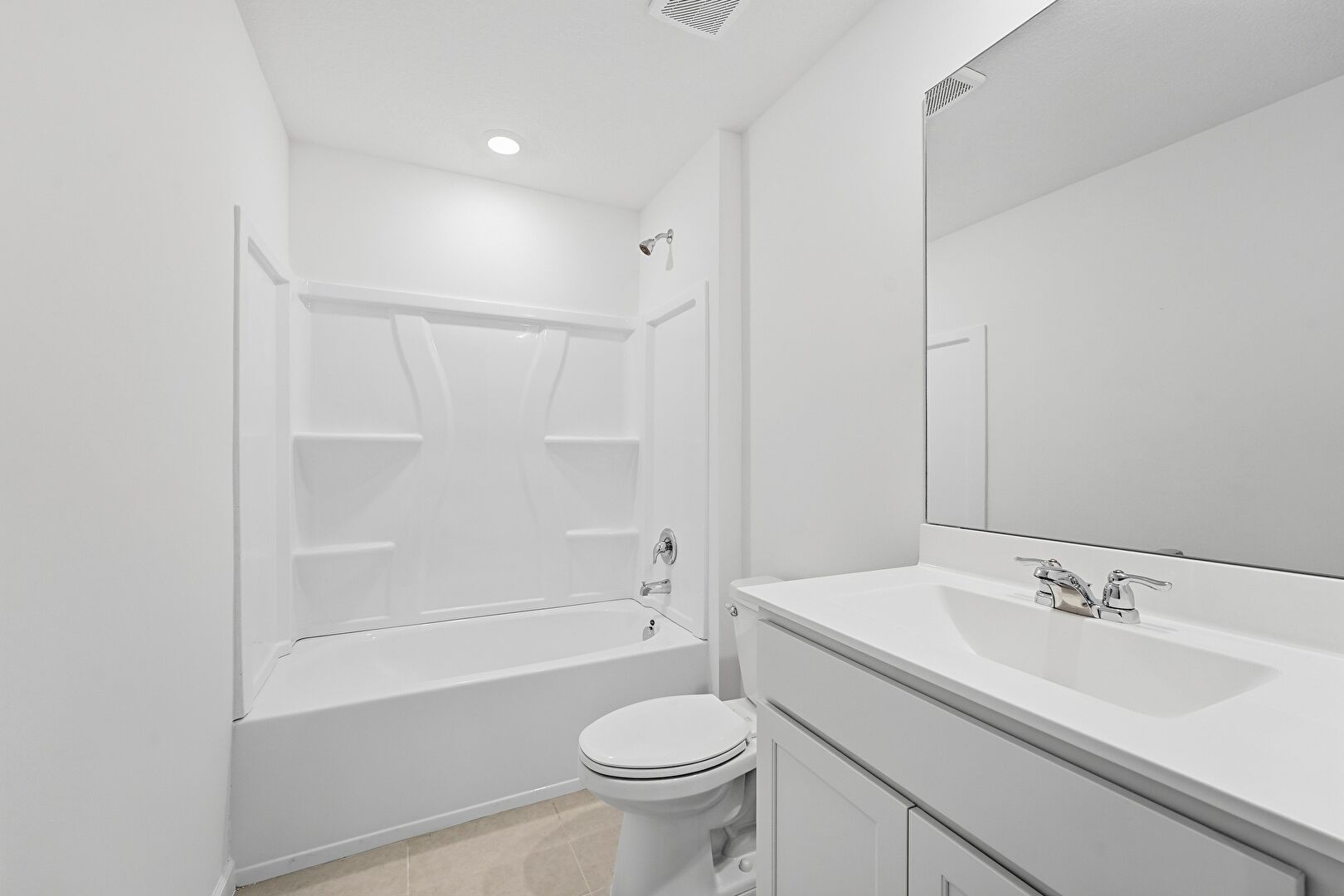 Combined Bath Shower, Drywall, Full Bathroom, Recessed Lighting, Tile Floor, Vanity, Vent, Full Bathroom, Recessed Lighting