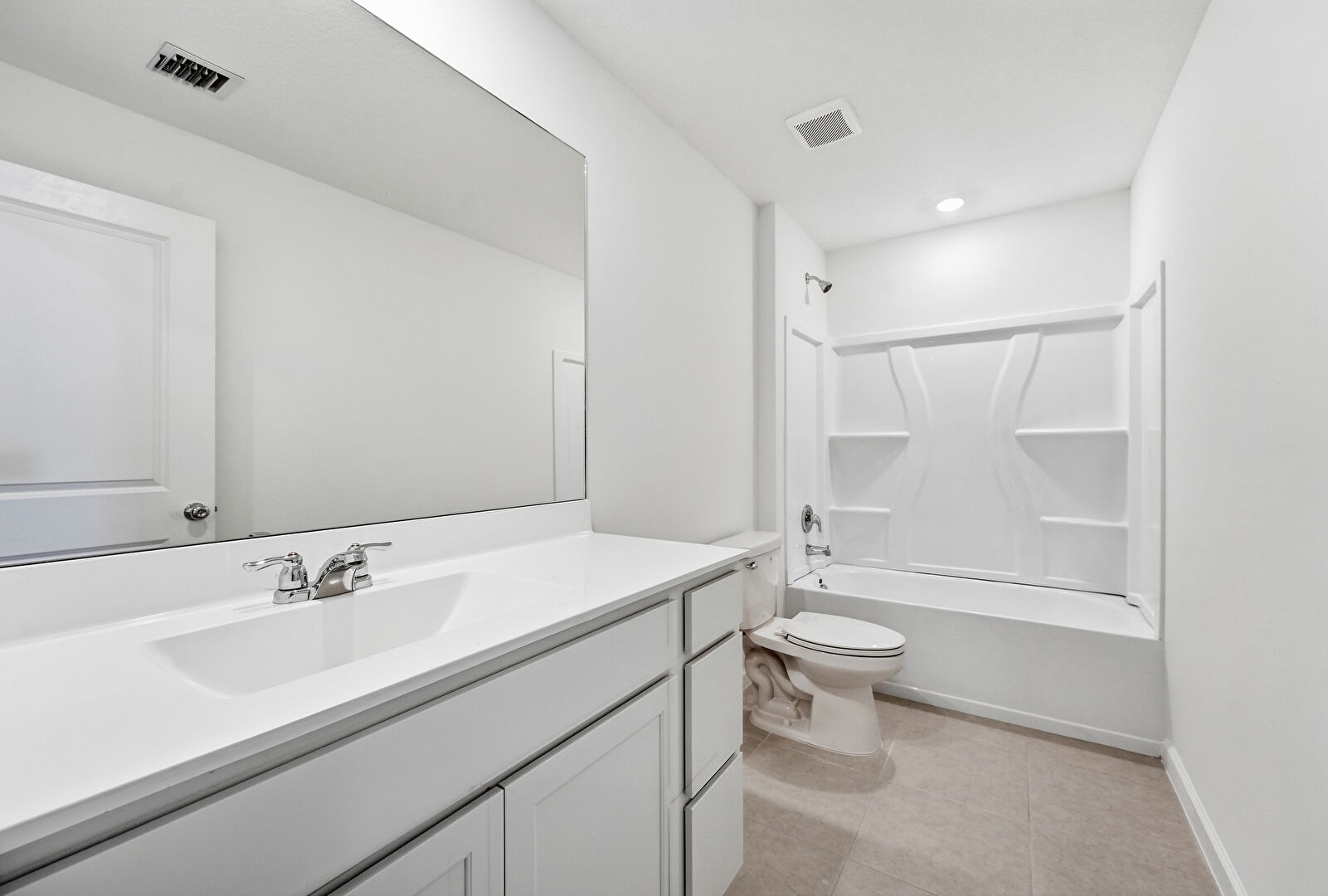 Baseboards Wall, Combined Bath Shower, Drywall, Full Bathroom, Tile Floor, Vanity, Vent, Recessed Lighting