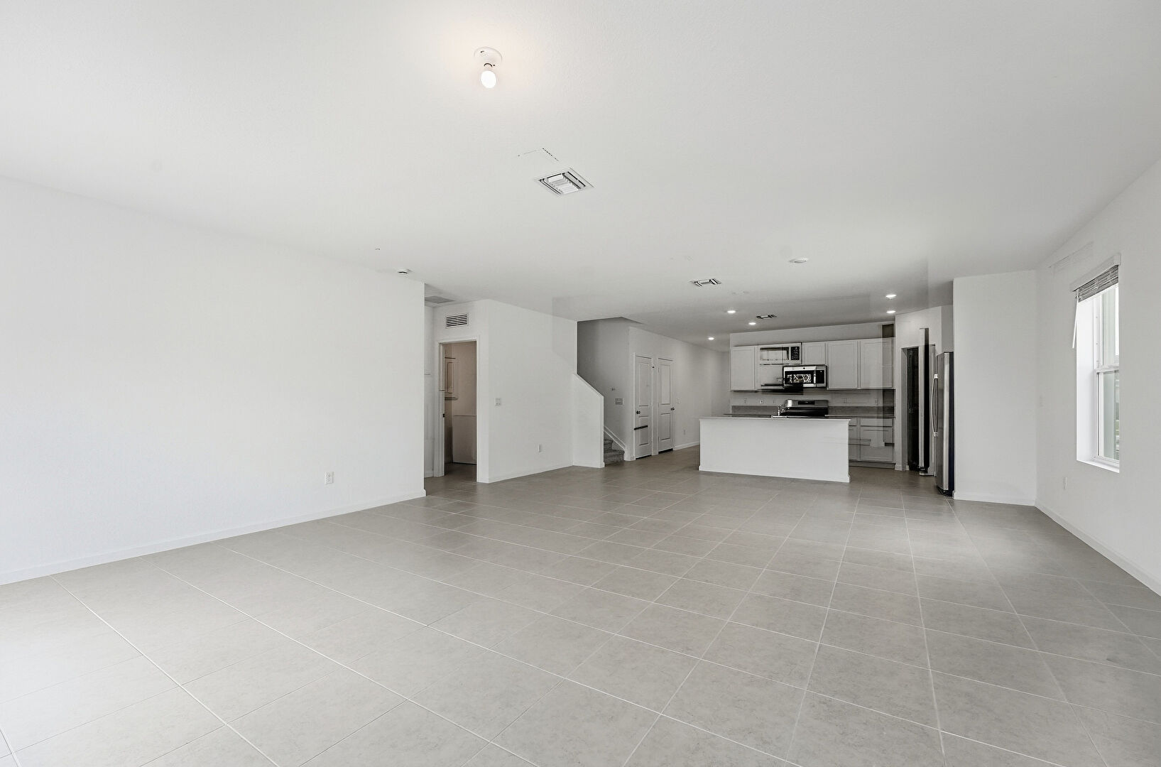 Baseboards Wall, Drywall, Natural Light, Recessed Lighting, Stairs, Tile Floor, Vent, L Shaped Kitchen, Natural Light