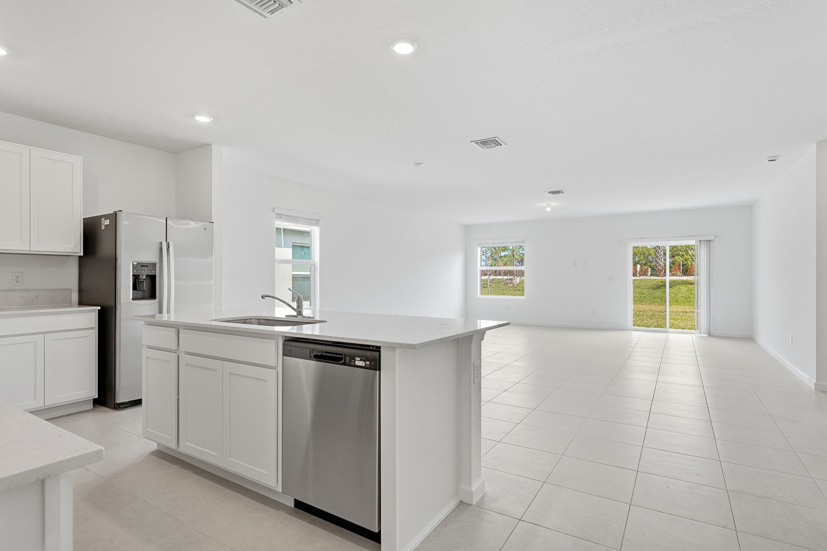 Baseboards Wall, Drywall, Kitchen Island, L Shaped Kitchen, Natural Light, Opens To Living Area, Recessed Lighting, Shaker Cabinets, Stone Countertops, Tile Floor, Vent, Drywall, Shaker Cabinets