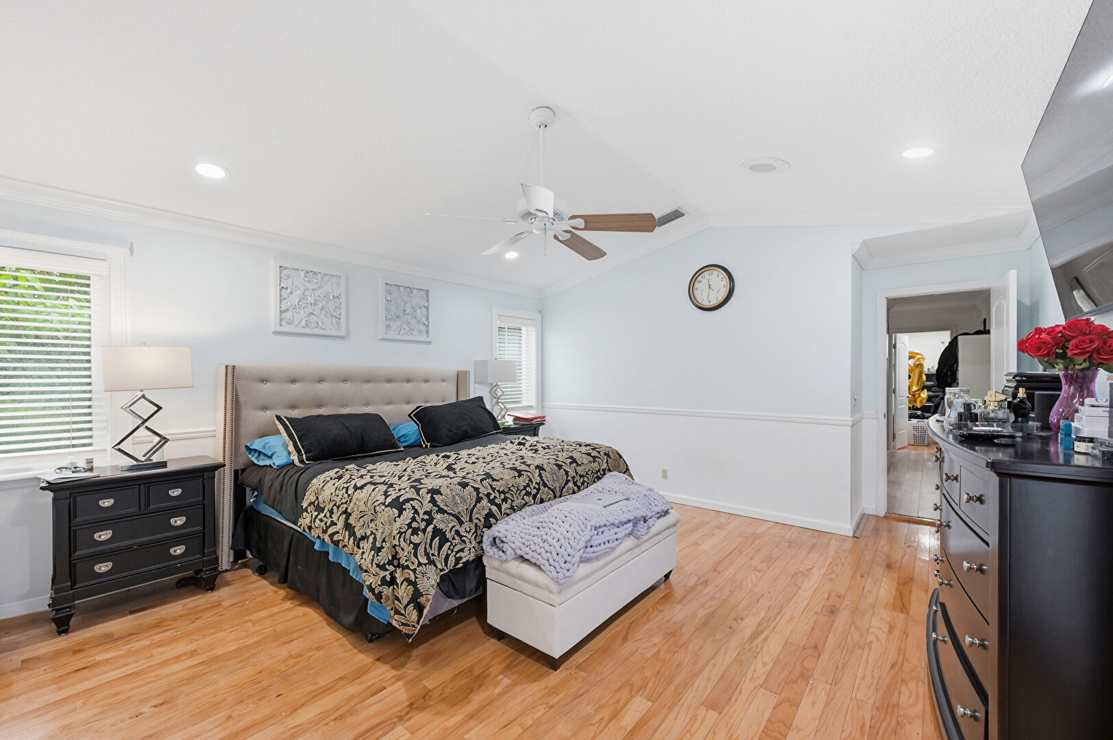 Access To Exterior, Baseboards Wall, Cathedral Ceiling, Ceiling Fan, Crown Molding, Drywall, Ensuite Bathroom, French Doors, Natural Light, Recessed Lighting, Vaulted Ceiling, Wood Finish Floor, Crown Molding, Recessed Lighting