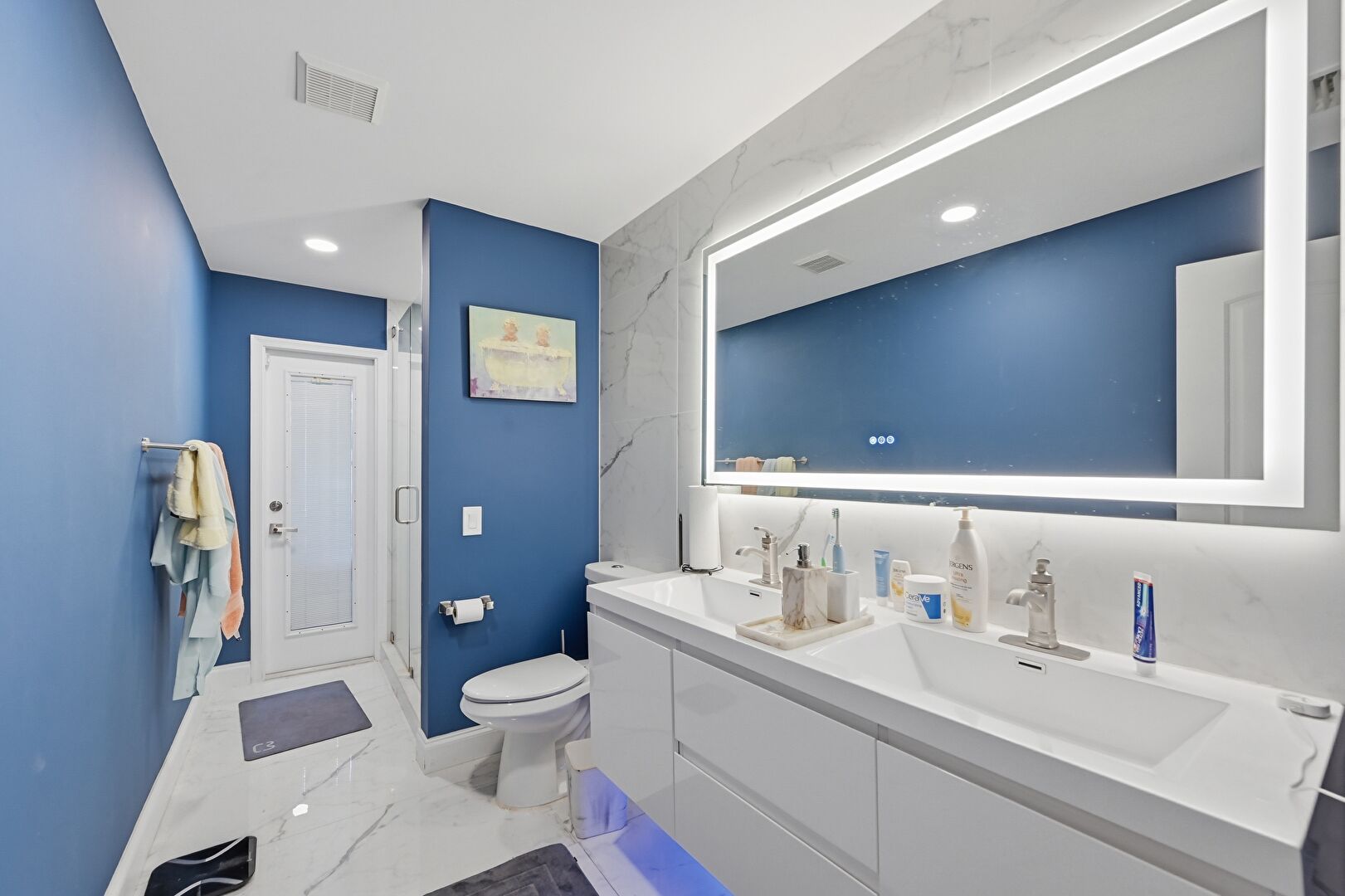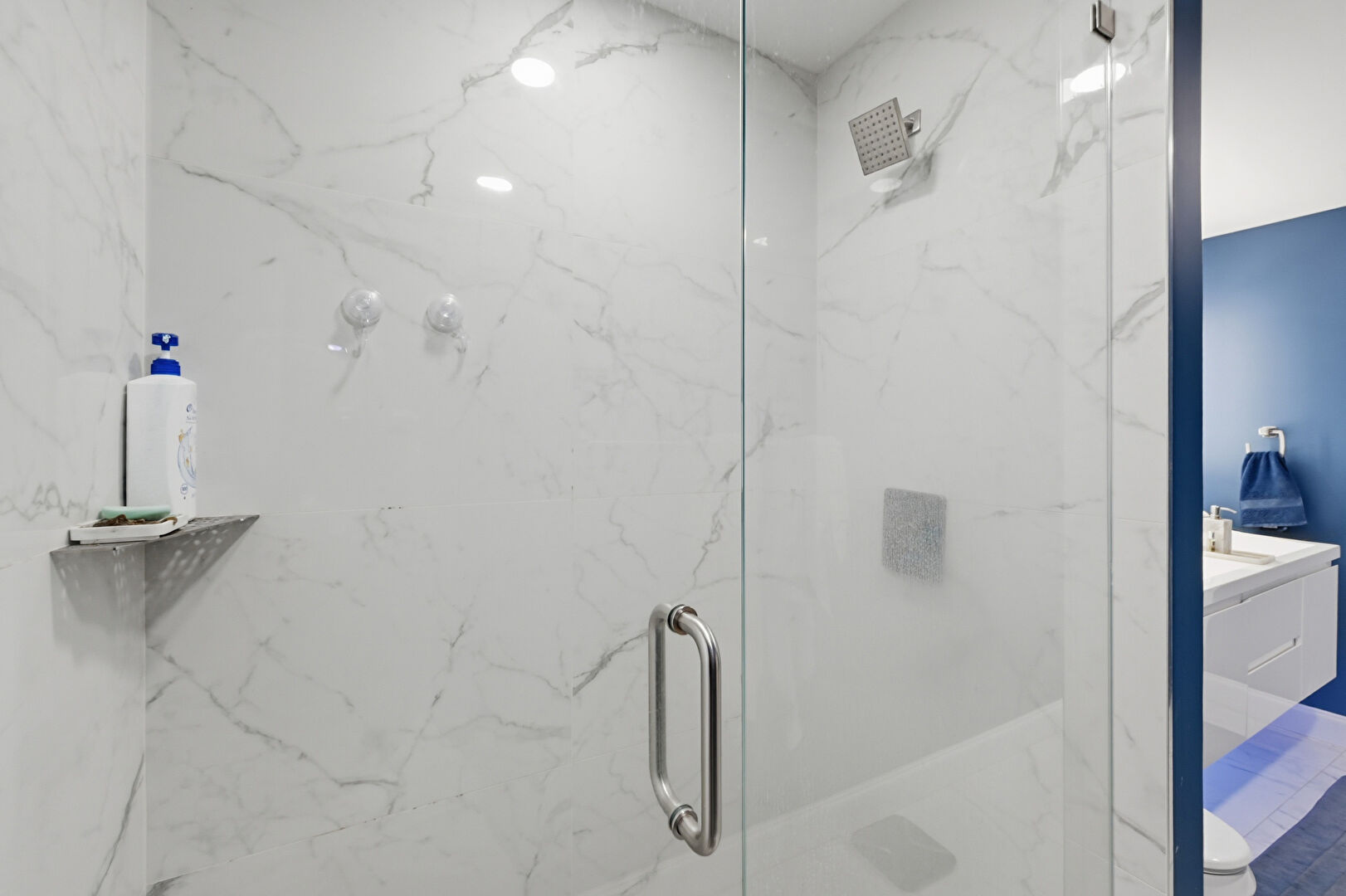 Baseboards Wall, Double Vanity, Drywall, Full Bathroom, Marble Finish Floor, Recessed Lighting, Vent, Full Bathroom, Vanity