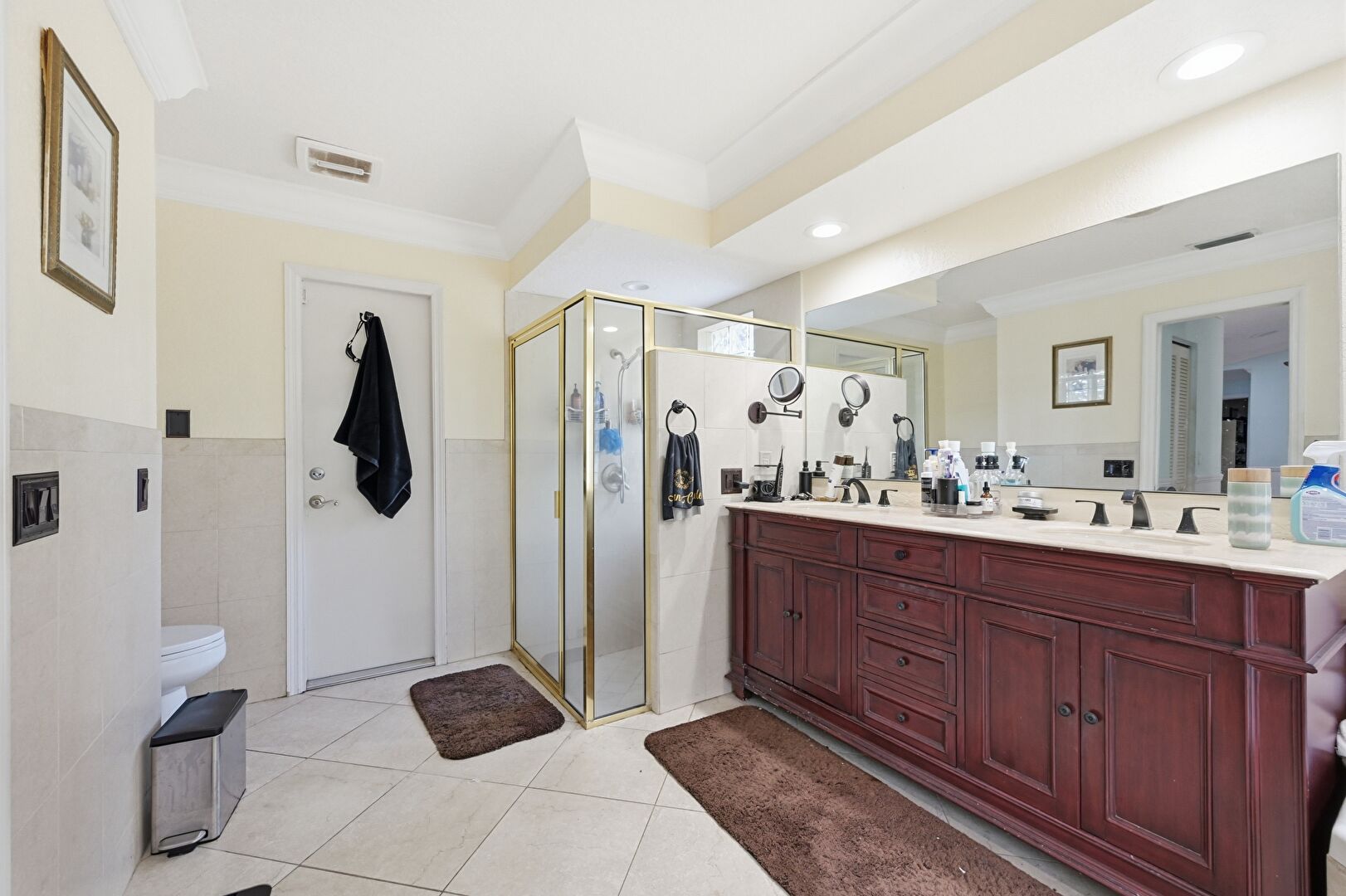 Crown Molding, Double Vanity, Drywall, Full Bathroom, Natural Light, Recessed Lighting, Tile Floor, Tile Wall, Vent, Wainscot Wall, Full Bathroom, Natural Light, Recessed Lighting