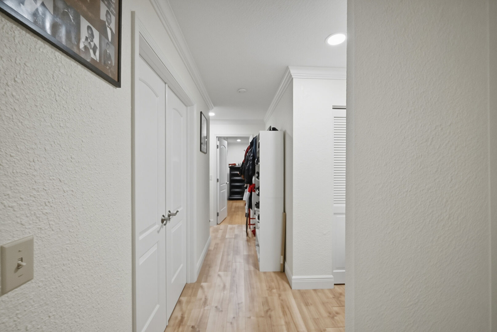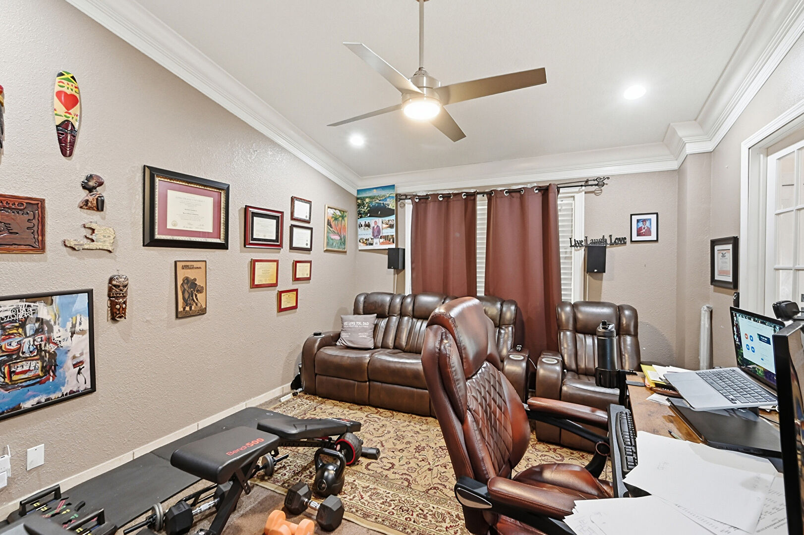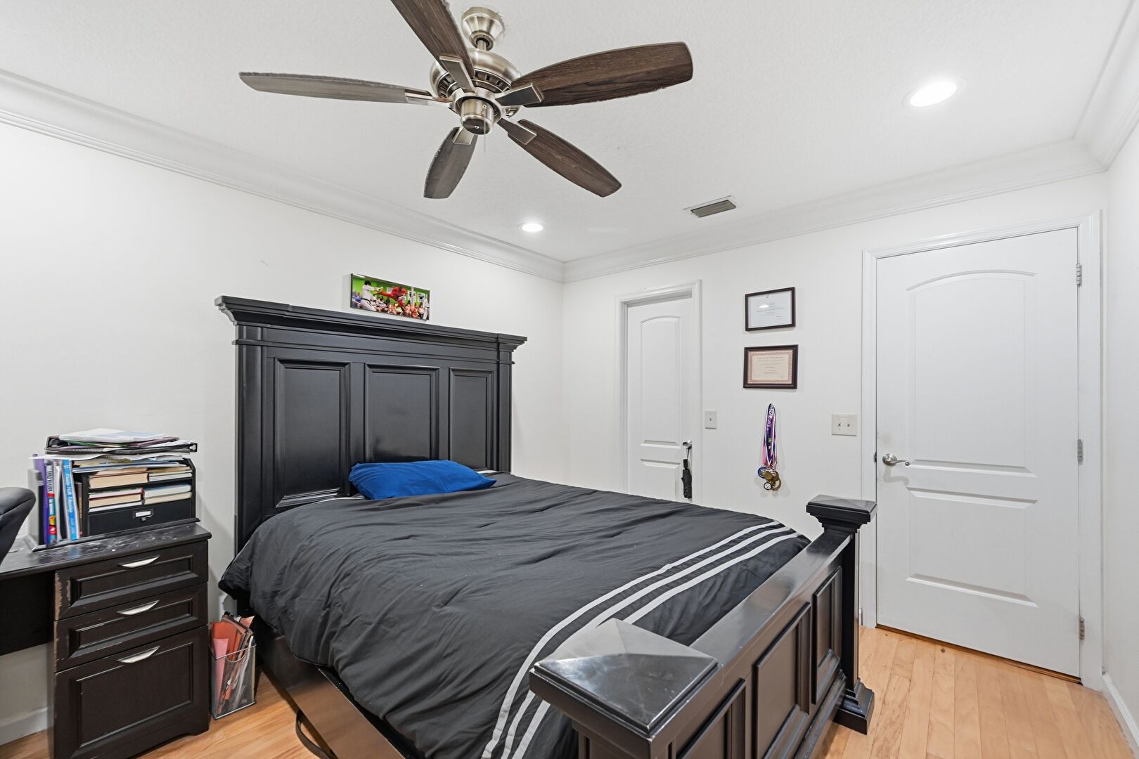 Baseboards Wall, Ceiling Fan, Crown Molding, Drywall, Natural Light, Office Area, Recessed Lighting, Two Closets, Vent, Wood Finish Floor, Ceiling Fan, Crown Molding, Office Area, Wood Finish Floor